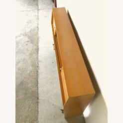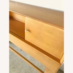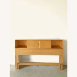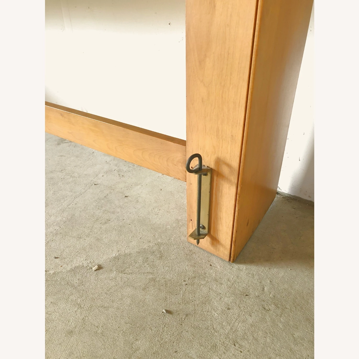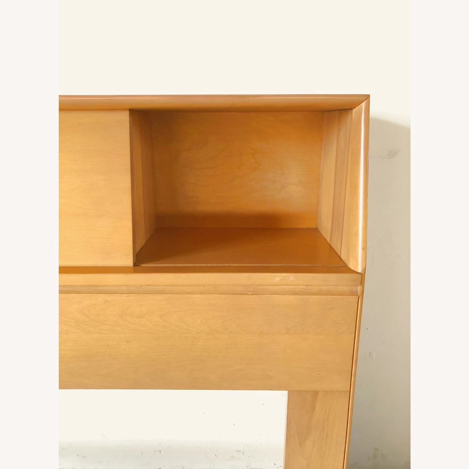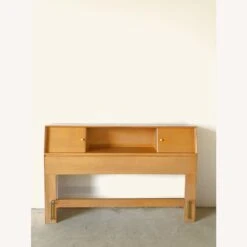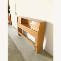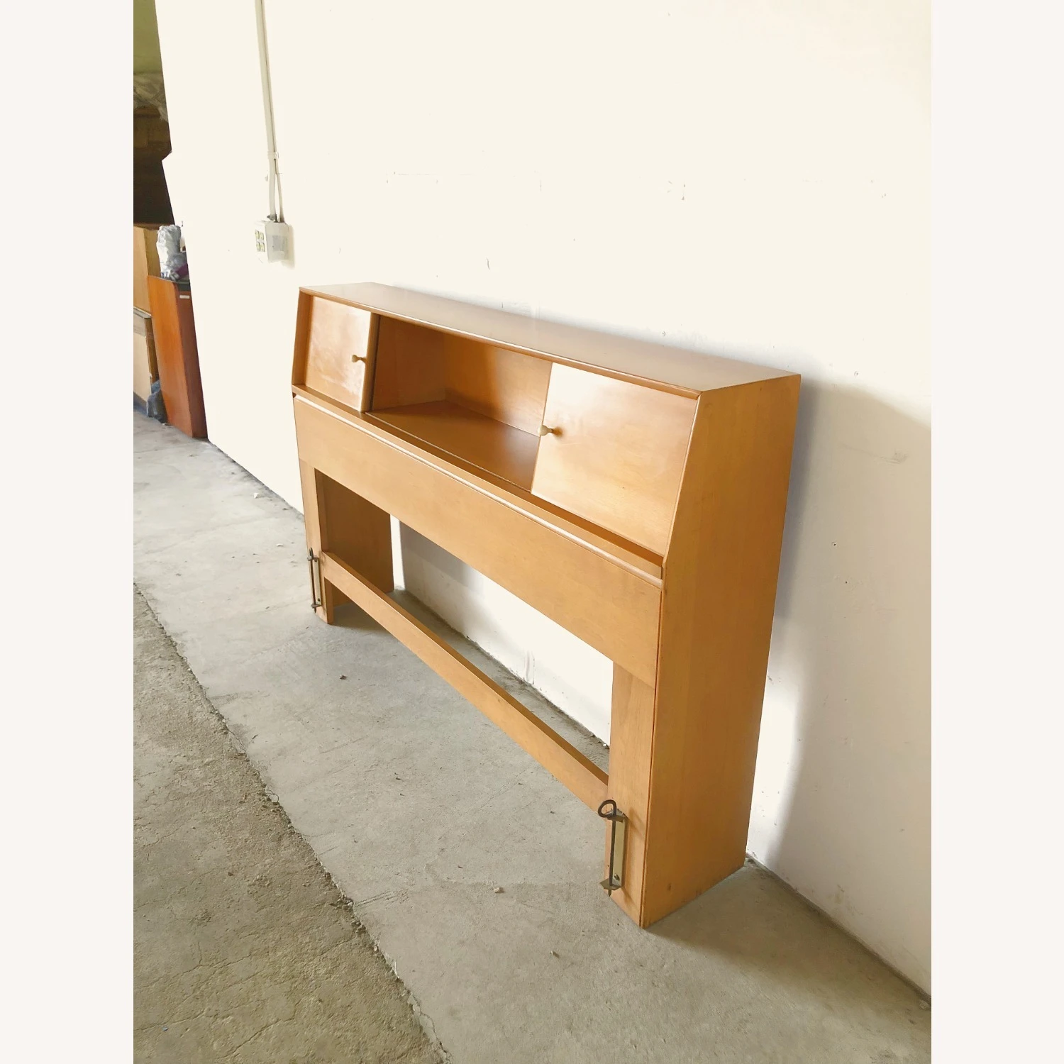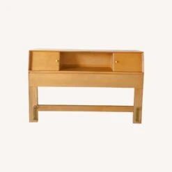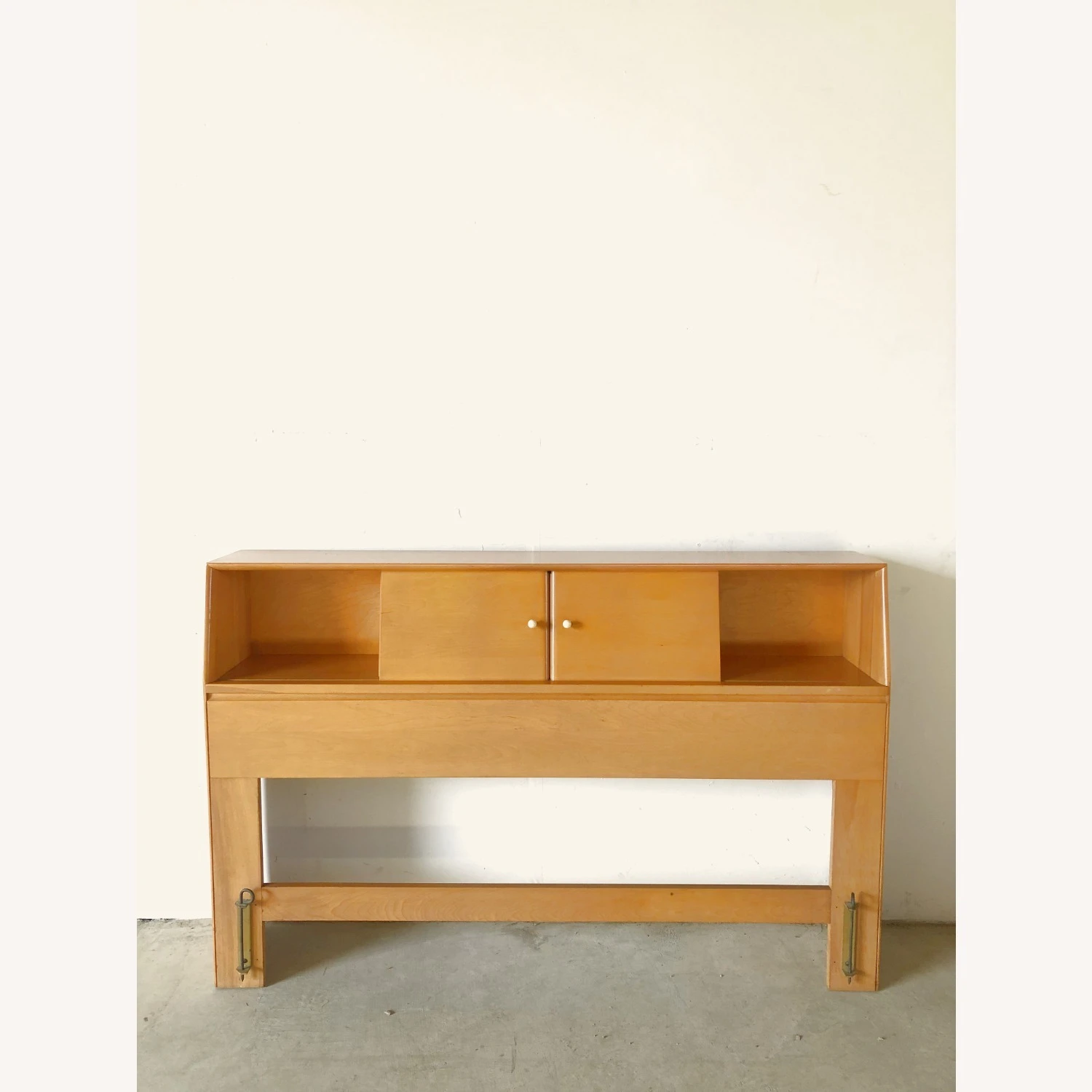 Seller’s Notes: This mid century modern headboard by Heywood Wakefield features hardwood construction, original Champagne finish, two sliding doors with white hardware, and a storage shelf that runs the length of the piece.