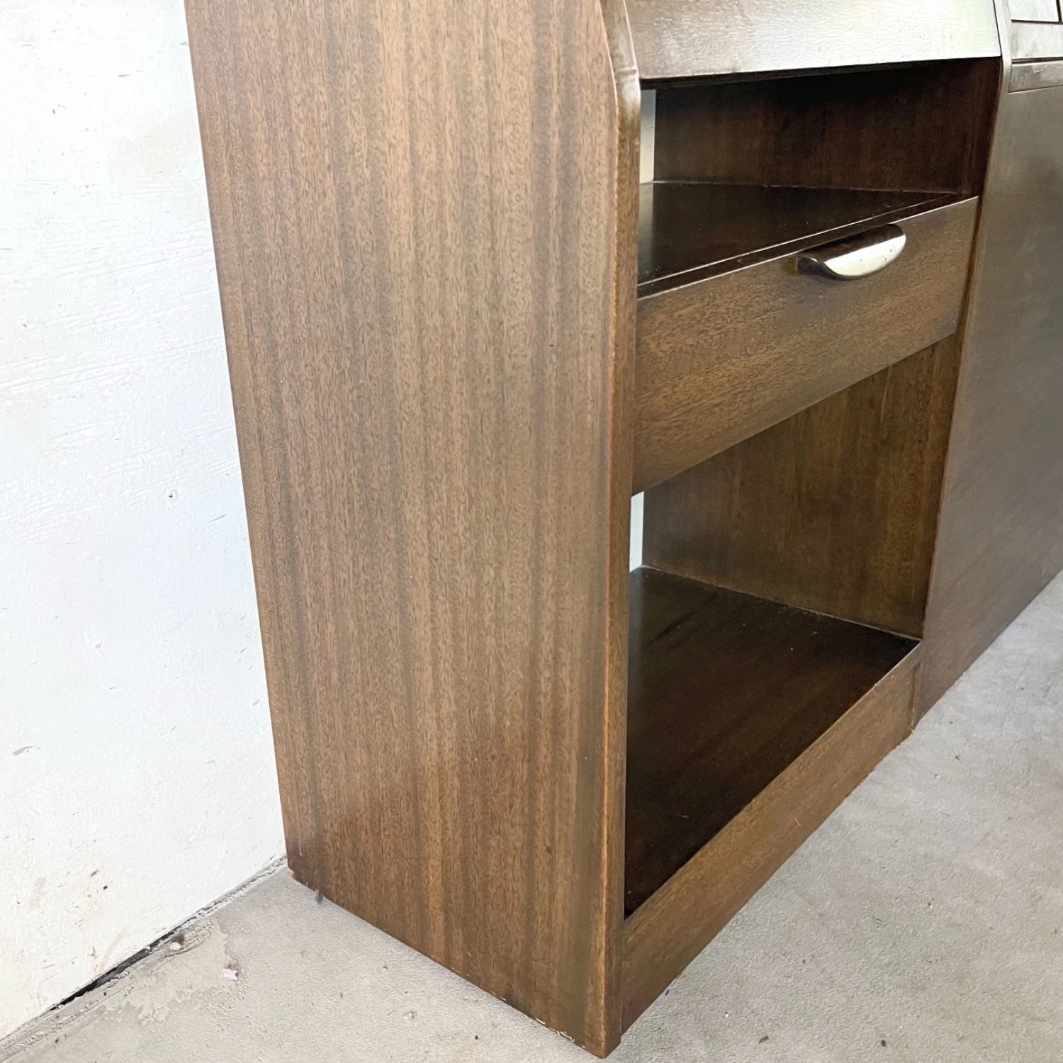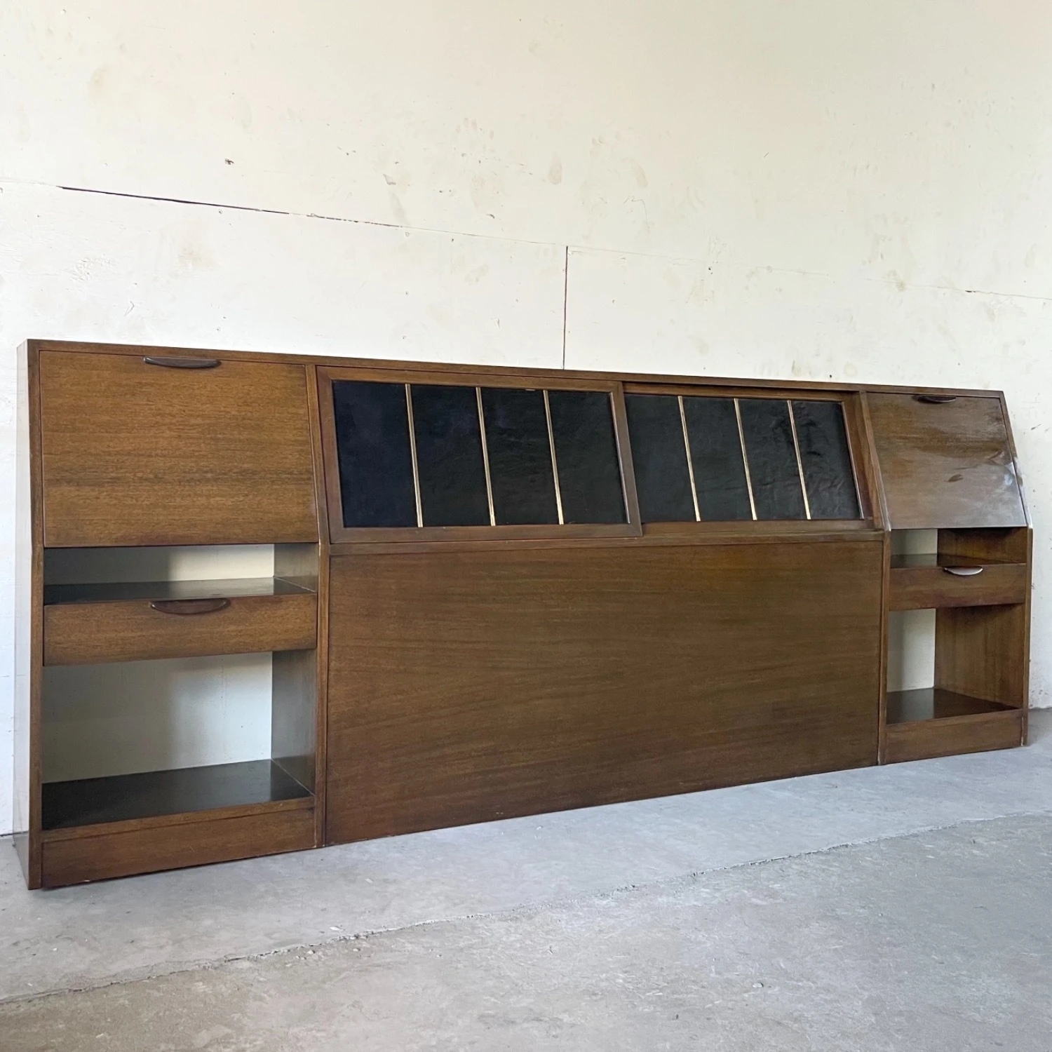 This impressive storage headboard from Harvey Probber features dark mahogany finish with stylish mid-century design including leatherette fabric sliding panels, drop front side tables, and original lighting elements. The substantial design of this mid-century full size headboard makes for a striking centerpiece to any bedroom setting while offering an array of bedside storage options. Matching nine drawer dresser, writing desk, chest of drawers, cabinet, and vanity available- contact seller for details.
