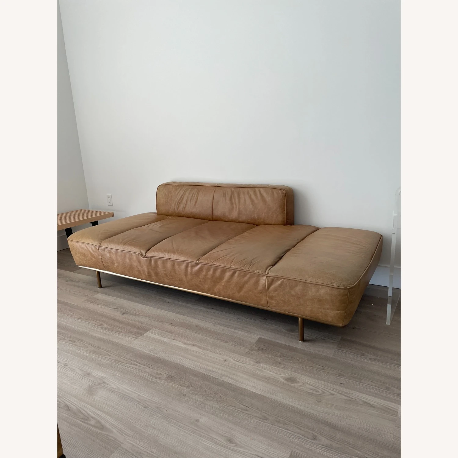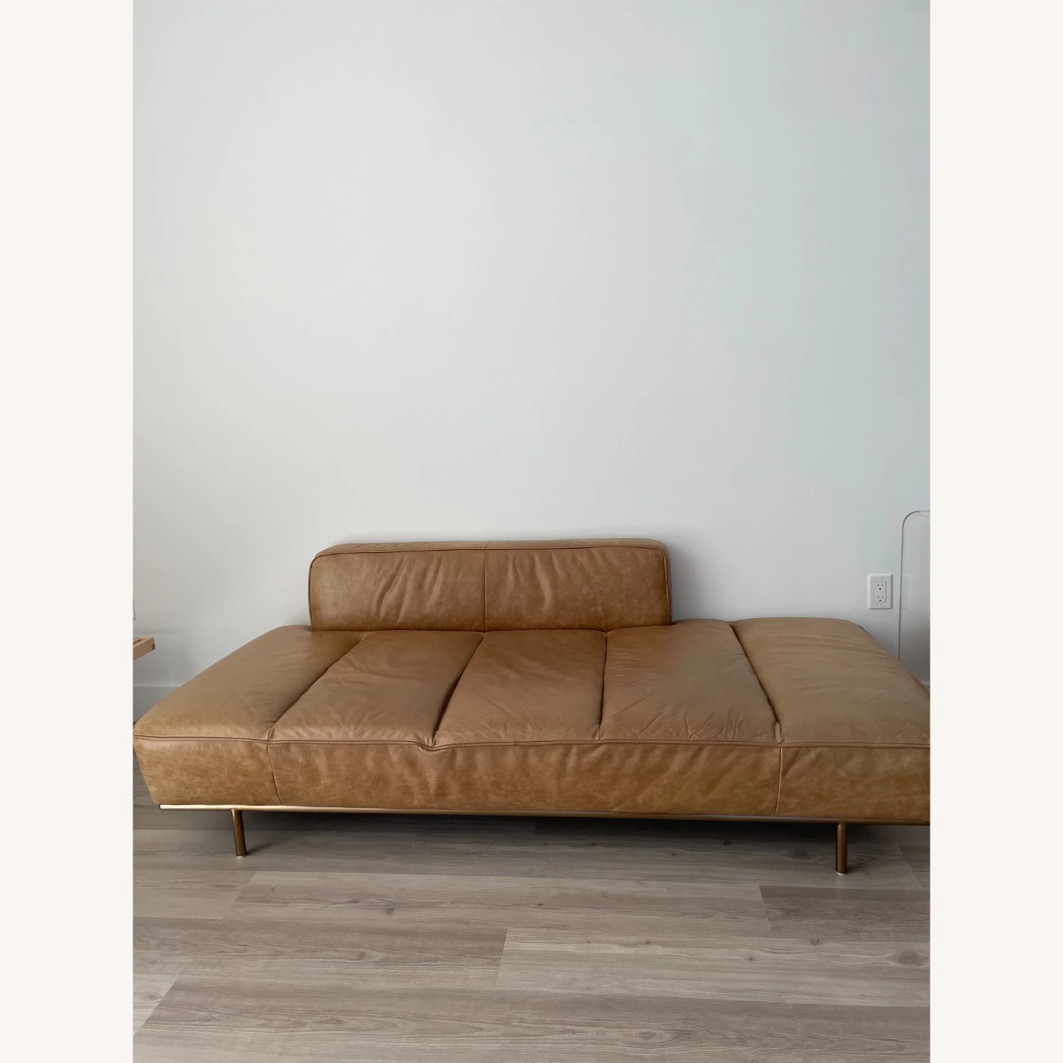 Midcentury meets so-right-now in this tumbled leather daybed with gleaming brass base. Designed exclusively for CB2 by Londoner Leonhard Pfeifer, the piece needed to achieve a lived-in look. So we searched and searched until we found the perfect leather: Rich buffalo from rural India dyed and tumbled for a soft, supple feel. As soon as this daybed is delivered, it’ll feel like you’ve had it for years. Perfectly worn and ready to lounge. Leather will continue to patina with character, year after year.
