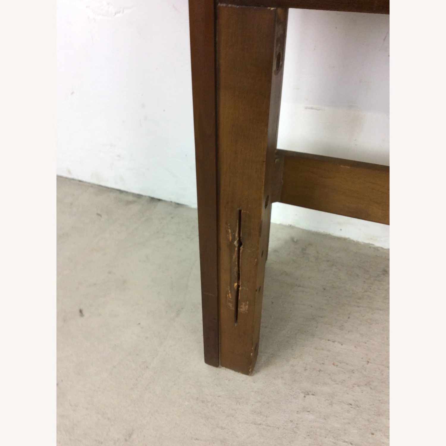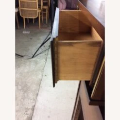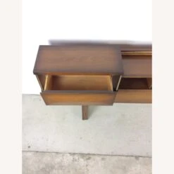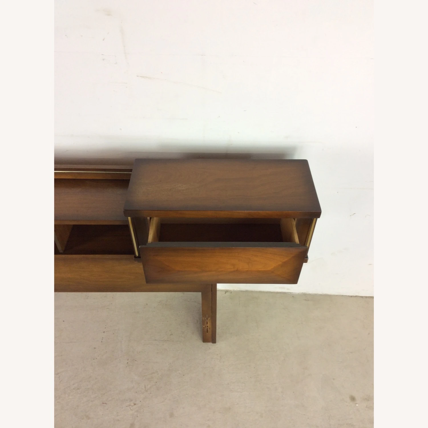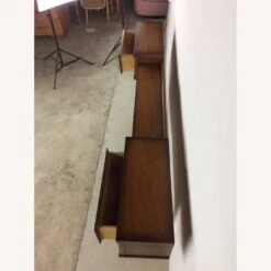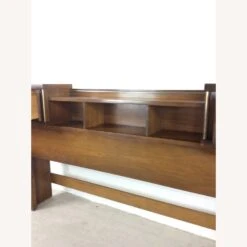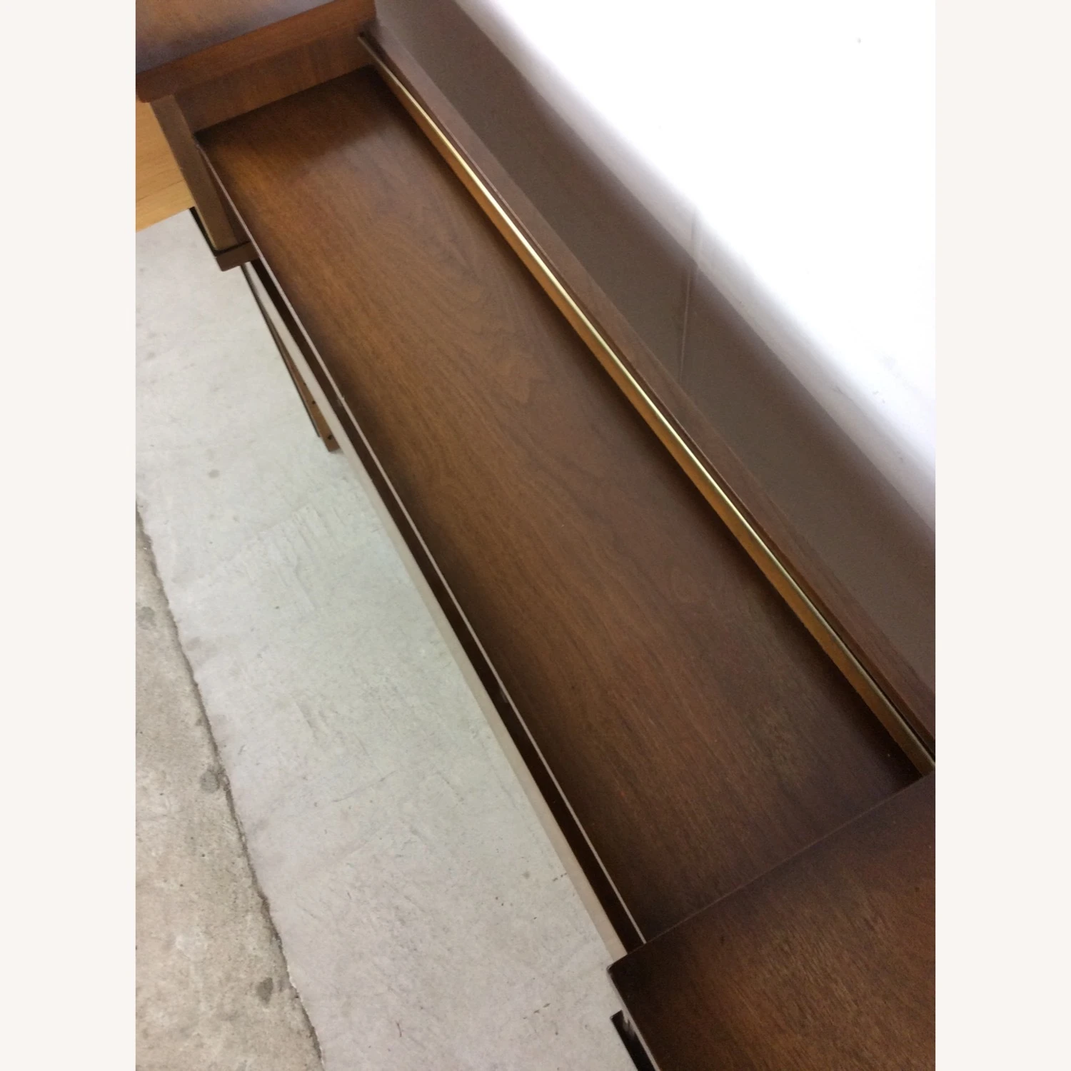 Original walnut finish is in excellent condition. Only minor discoloration on top, slight edge dings, and small scratches consistent with age and regular use. The pair of nightstands available separately can nest under the drawers in this headboard. 9/10