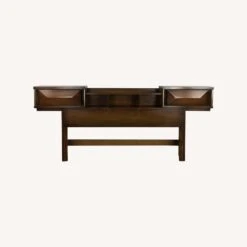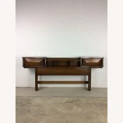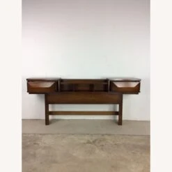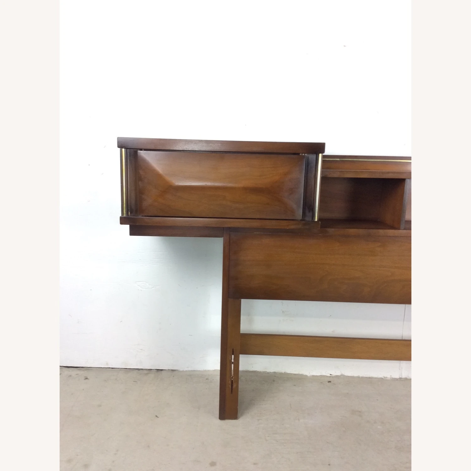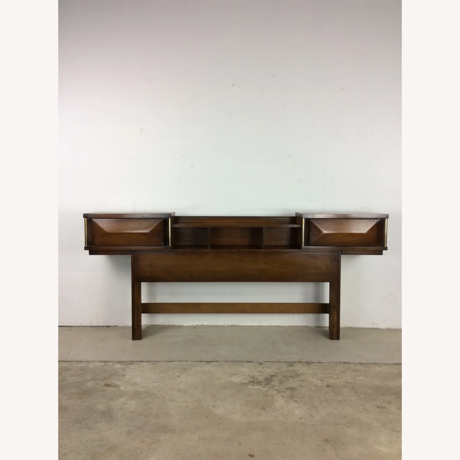 Seller’s Notes: This mid century modern king sized headboard features hardwood construction, original walnut finish with sunburst style coloration, brass trim, and two drawers with beveled drawer faces.