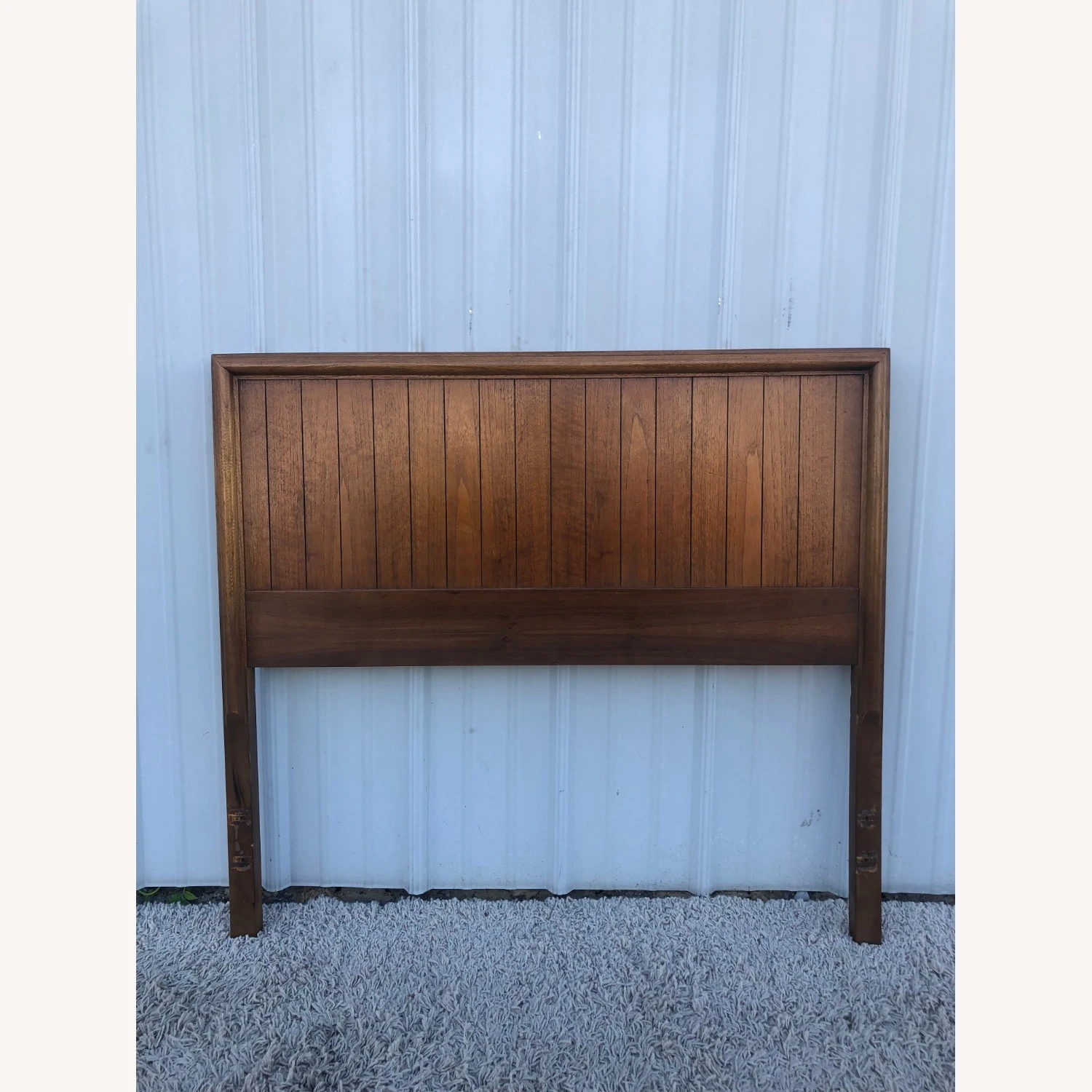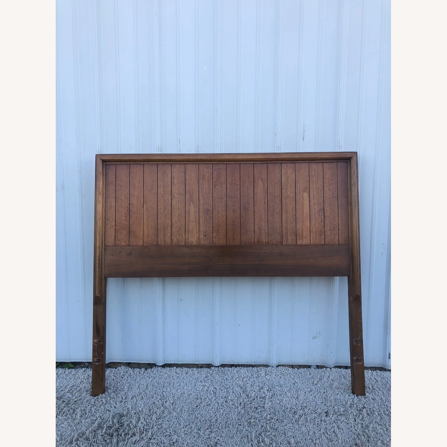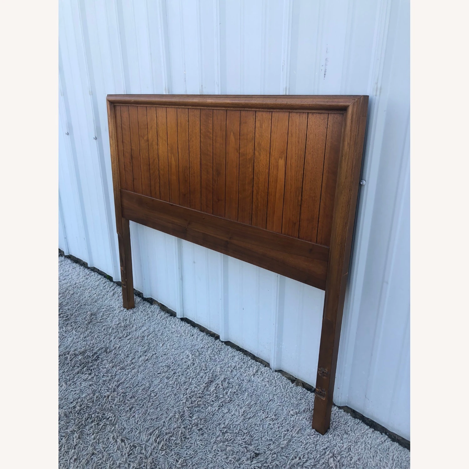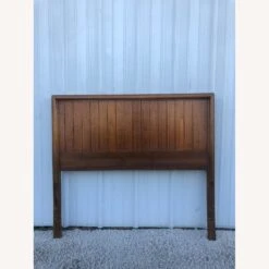 Seller’s Notes: This mid century modern twin headboard by Lane Furniture features solid wood construction, original walnut finish, and a vertical pin stripe detailing on the front. Two available.