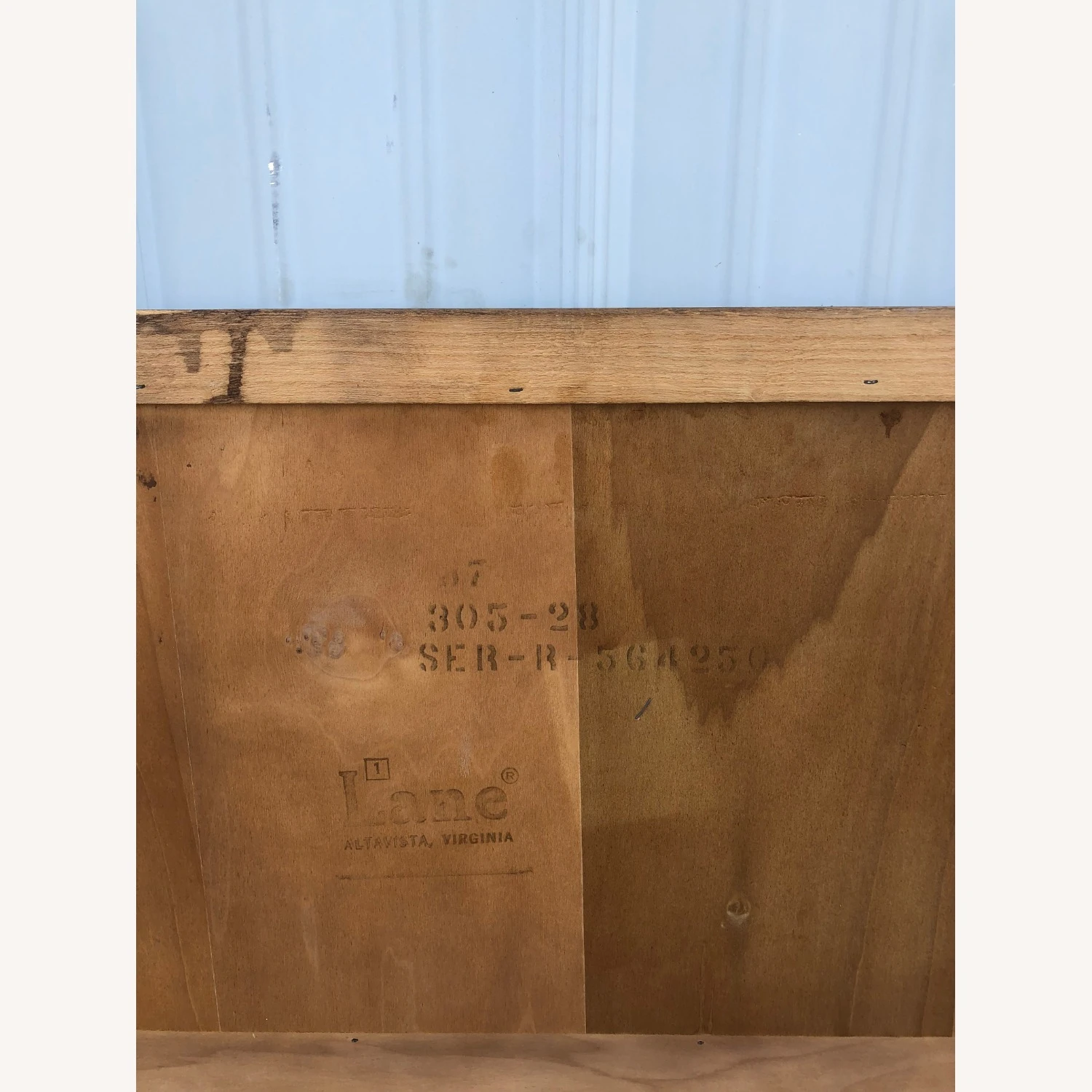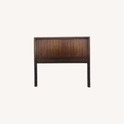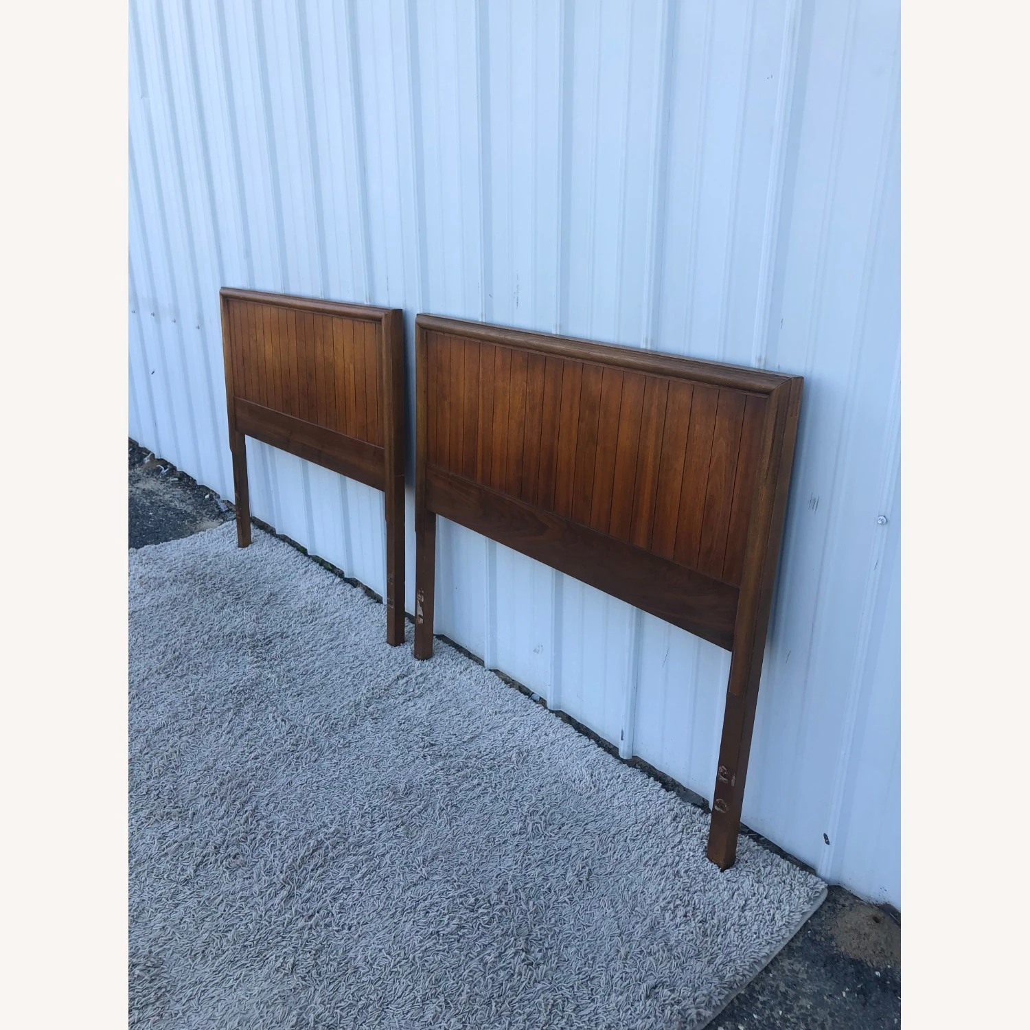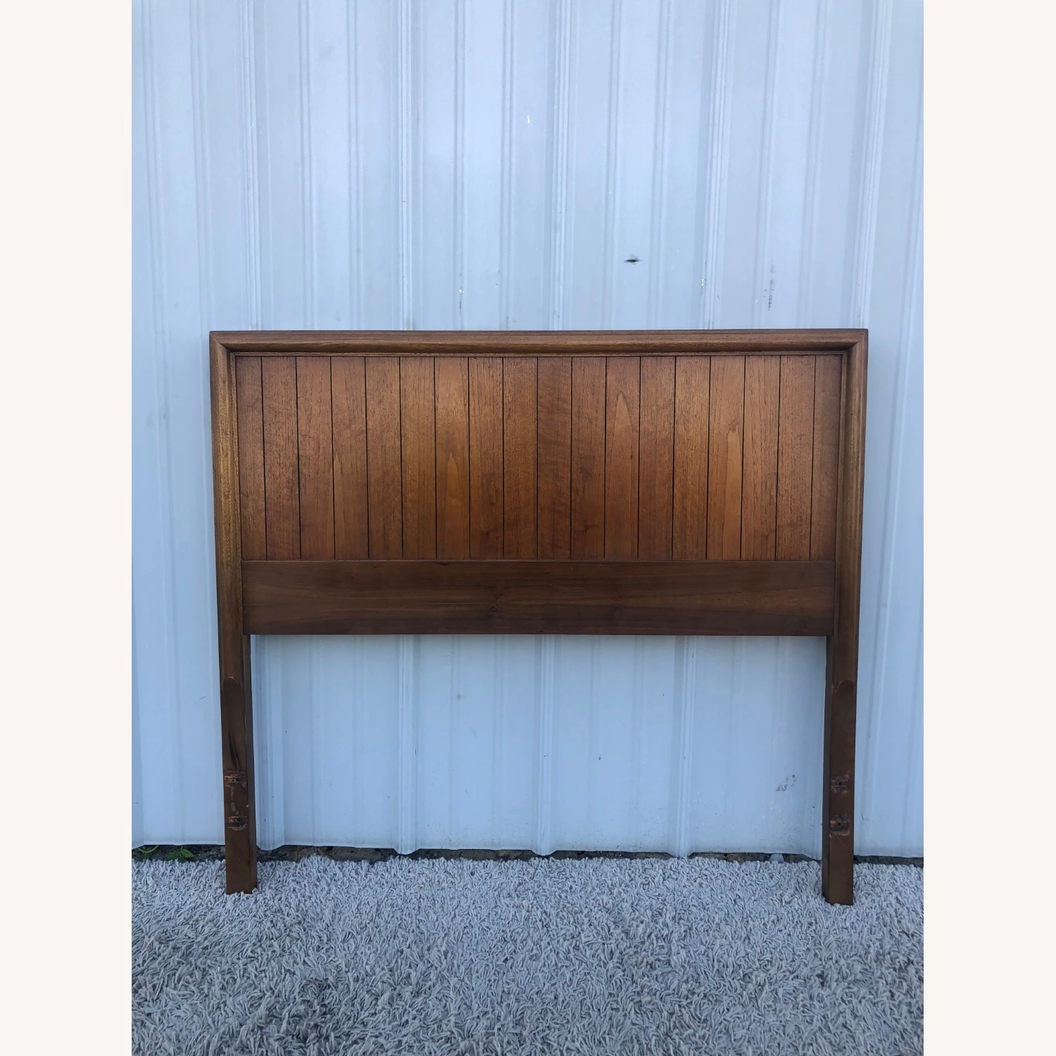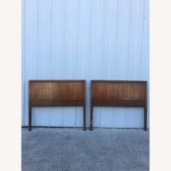 Seller’s Notes: This mid century modern twin headboard by Lane Furniture features solid wood construction, original walnut finish, and a vertical pin stripe detailing on the front. Two available.