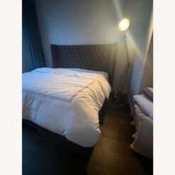 Seller’s Notes: A bit of Modern English in the wraparound wings and deep diamond tufting of the headboard. Finishing the look are upholstered side rails and an extra-low wrap- around curved footboard on upholstered feet.
