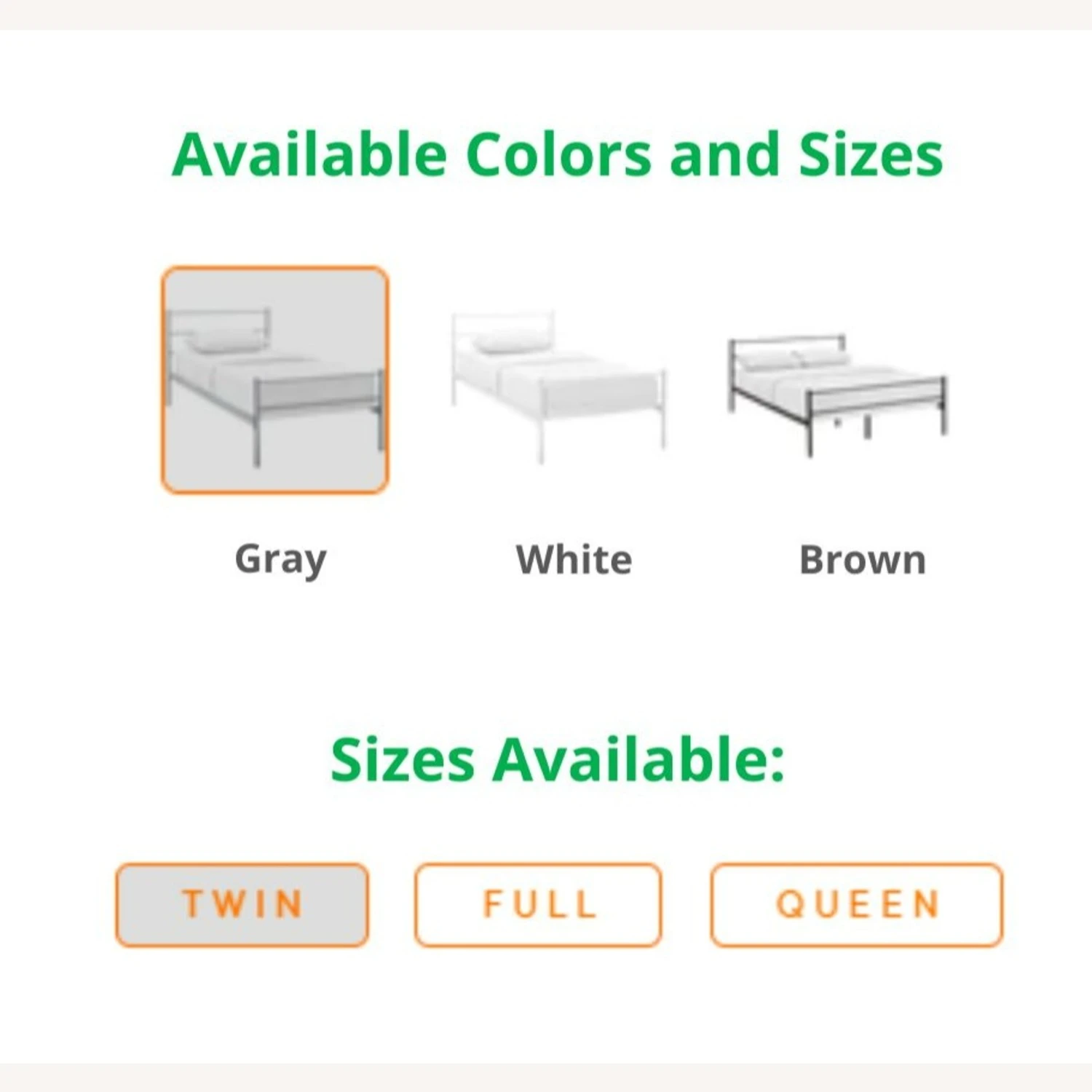 This model comes in these colors: GRAY, WHITE, & BROWN, and these sizes: TWIN, FULL, & QUEEN. If you are interested in a color/size other than that of this listing, and if the quantity you wish to purchase is greater than what is listed here, please message us for availability.