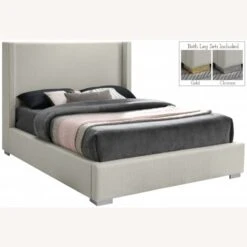 • The headboard, sides and footboard of this bed are covered in rich beige linen textured fabric for a sleek yet chic touch.