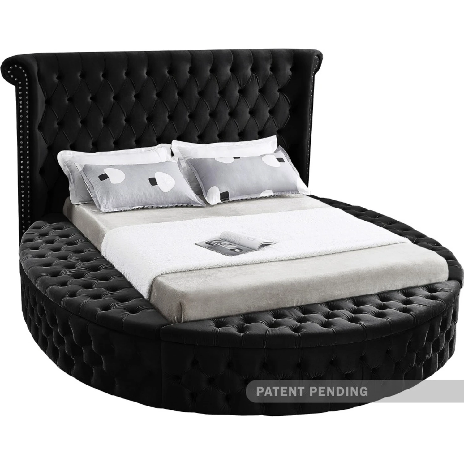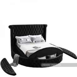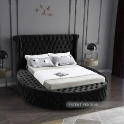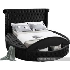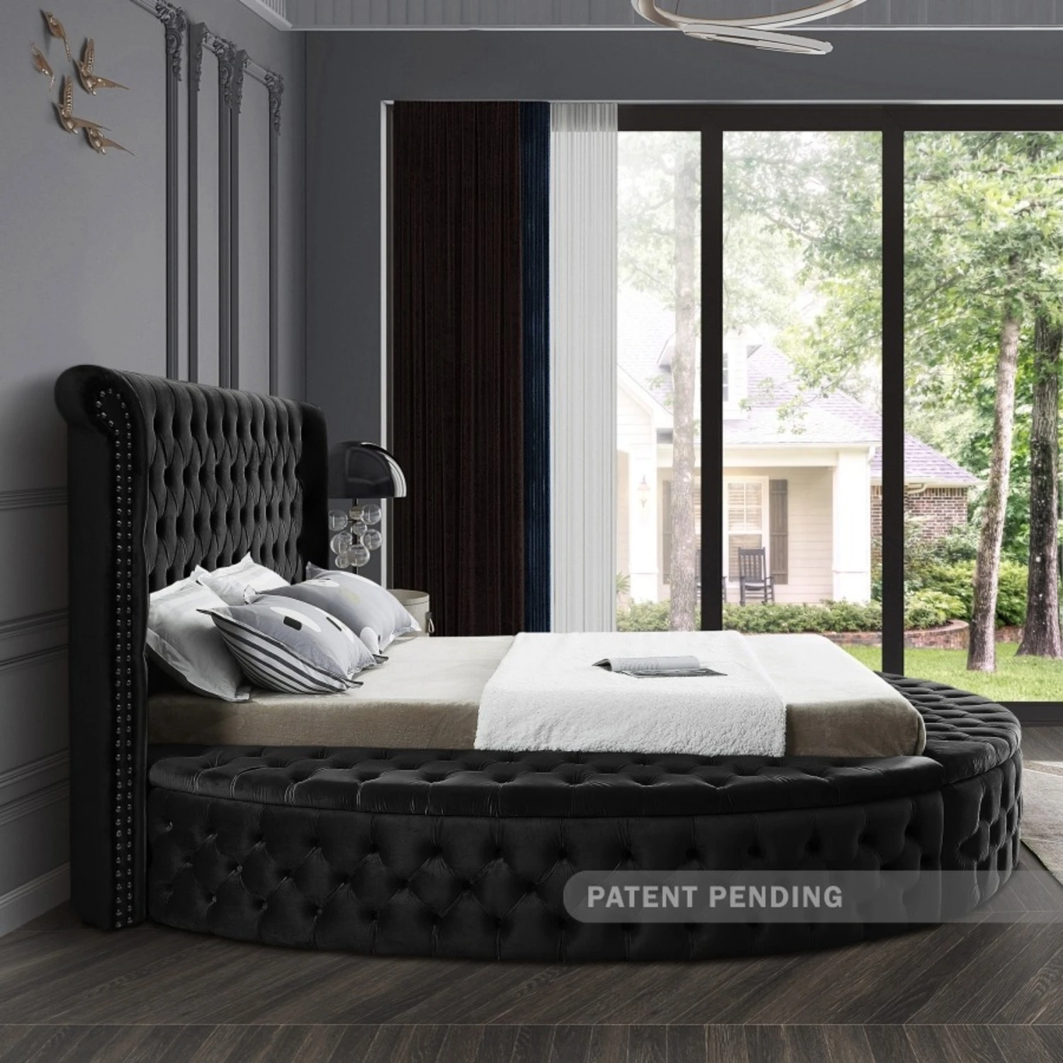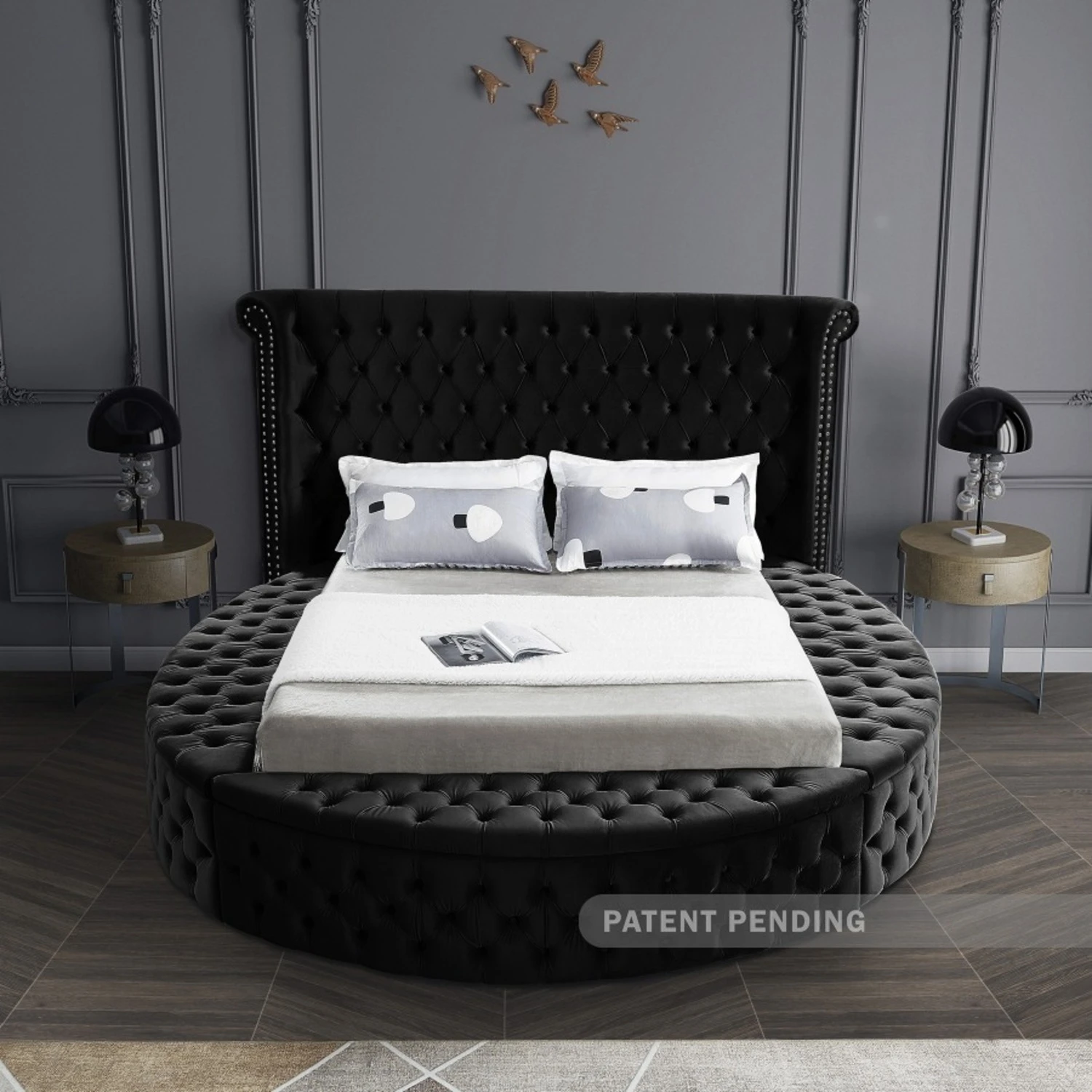• Marvel at the remarkable beauty and graceful lines of this round black velvet full size bed.