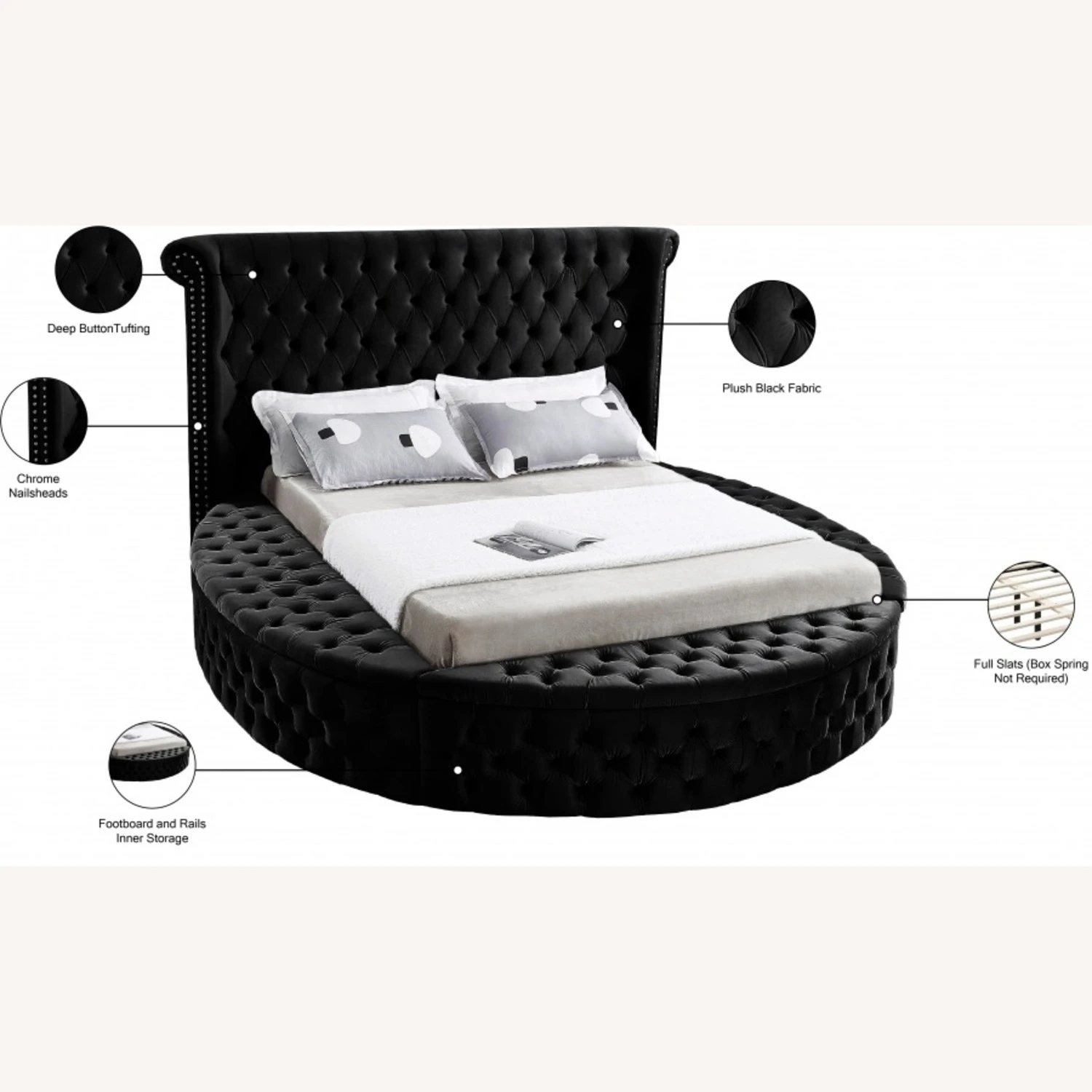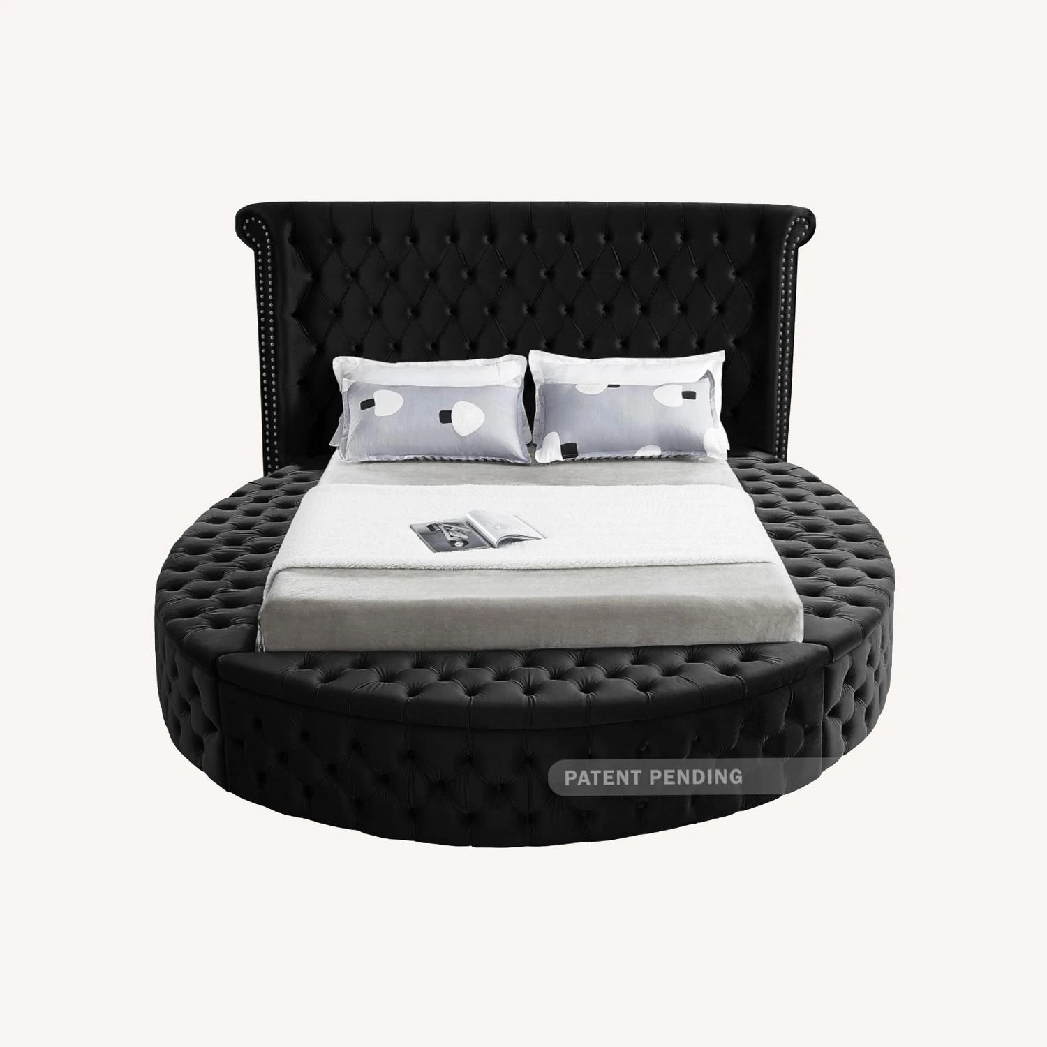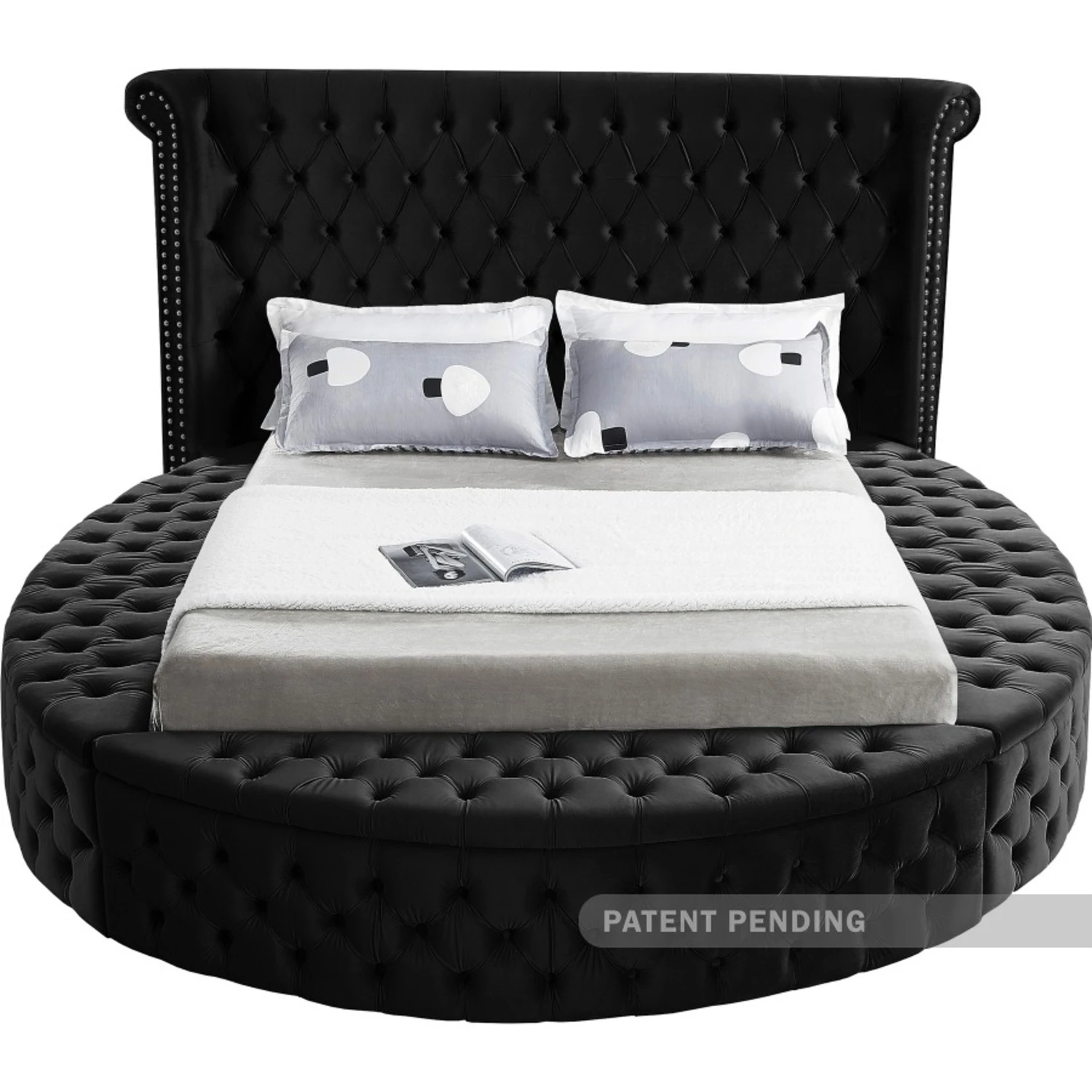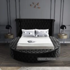 • Marvel at the remarkable beauty and graceful lines of this round black velvet full size bed.