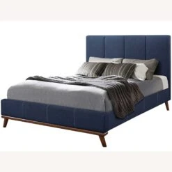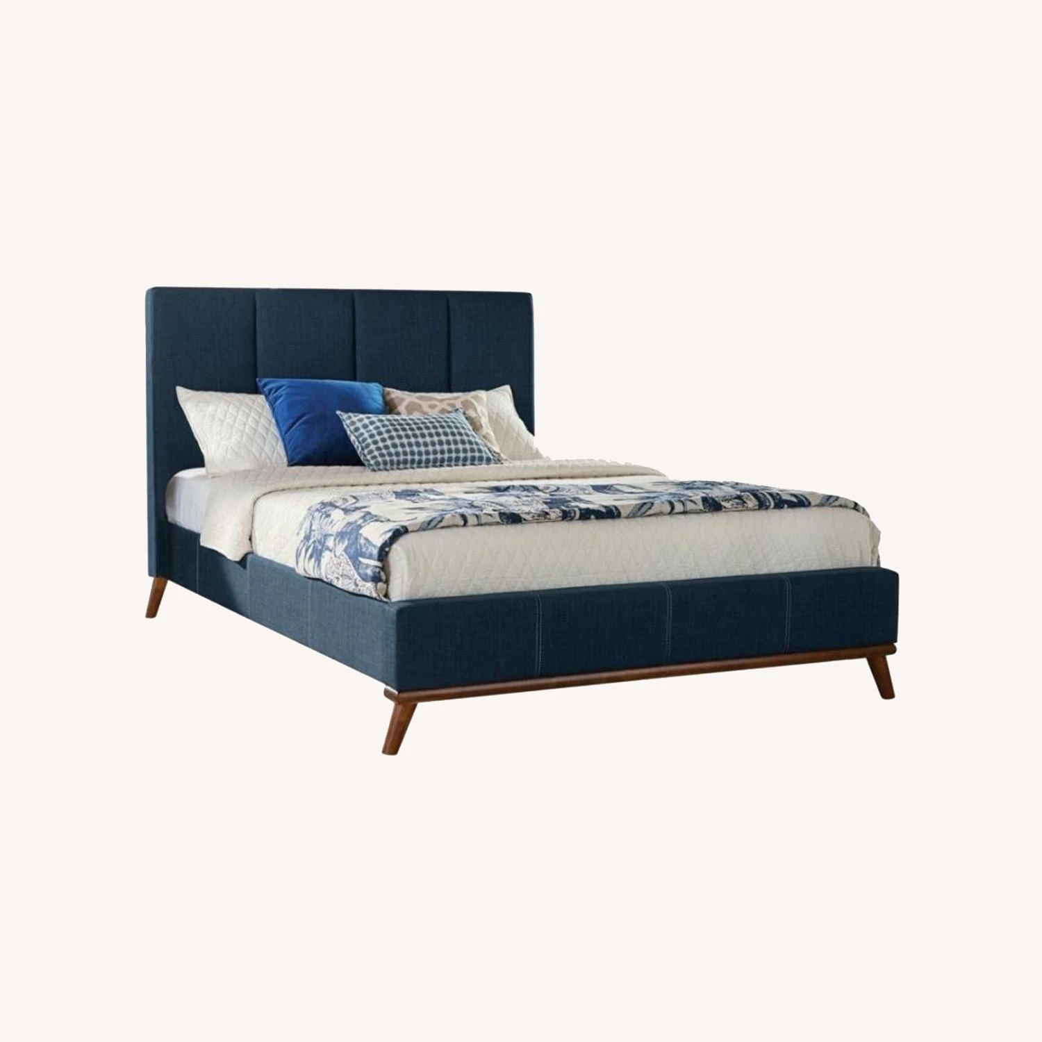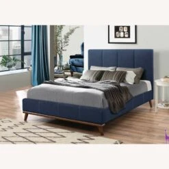 • Platform bed features vertical channeling with an exposed frame and angled legs