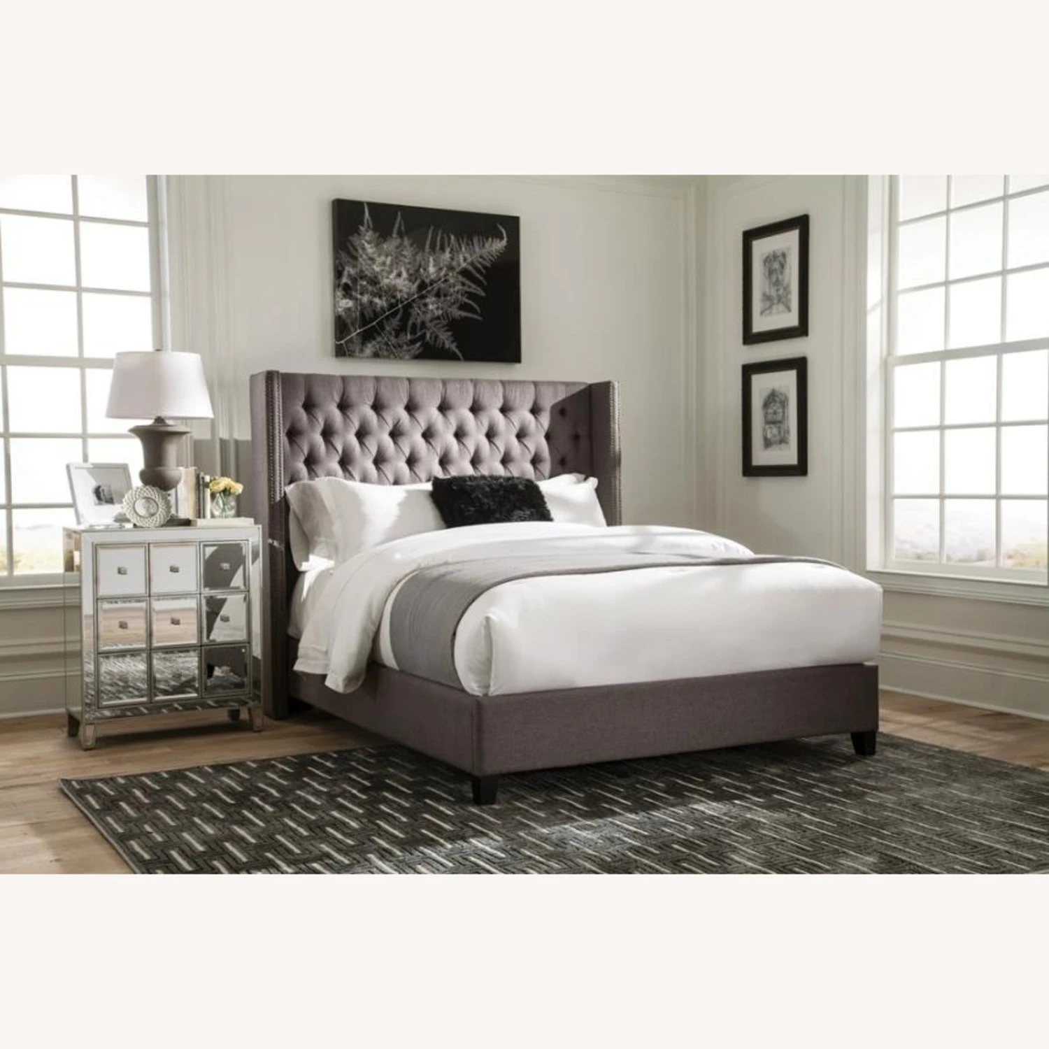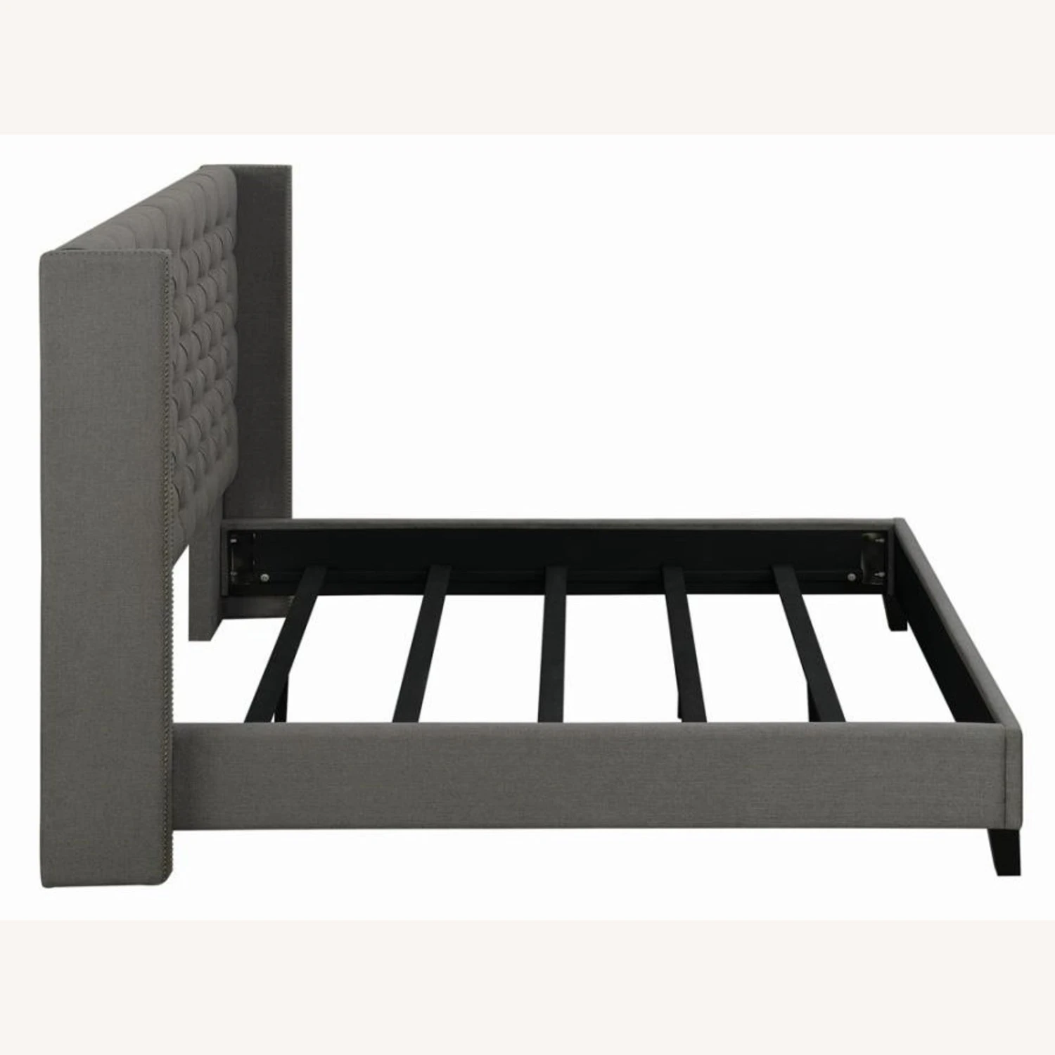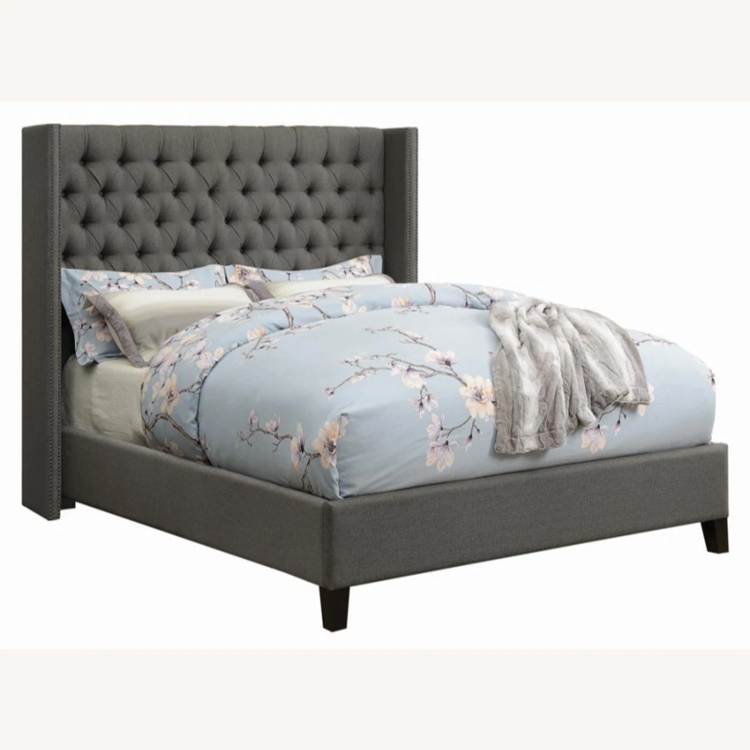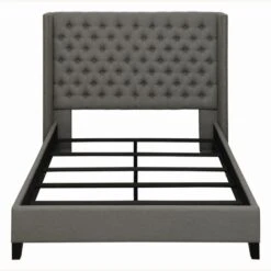 • Eye-catching demi-wing bed is upholstered in a grey woven fabric