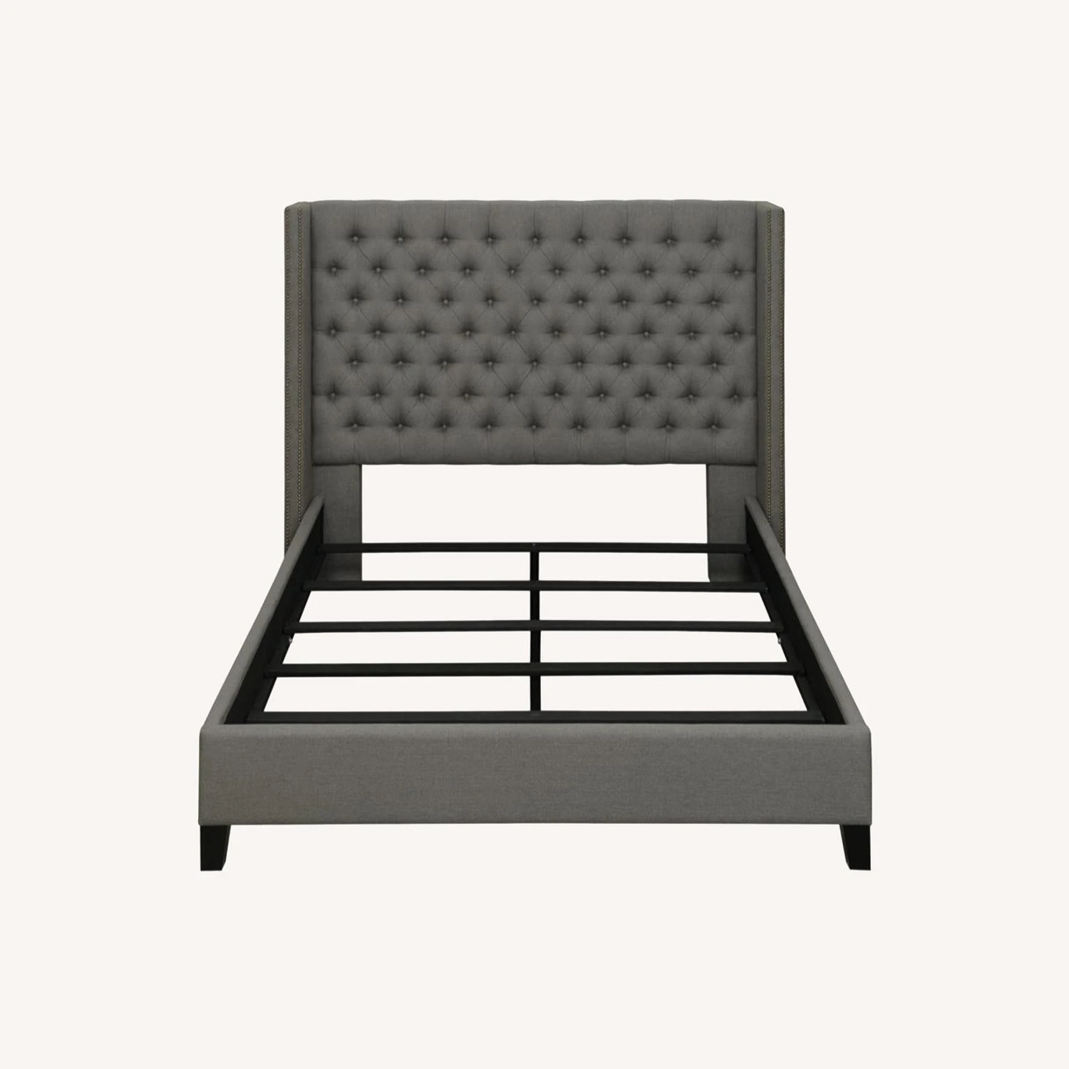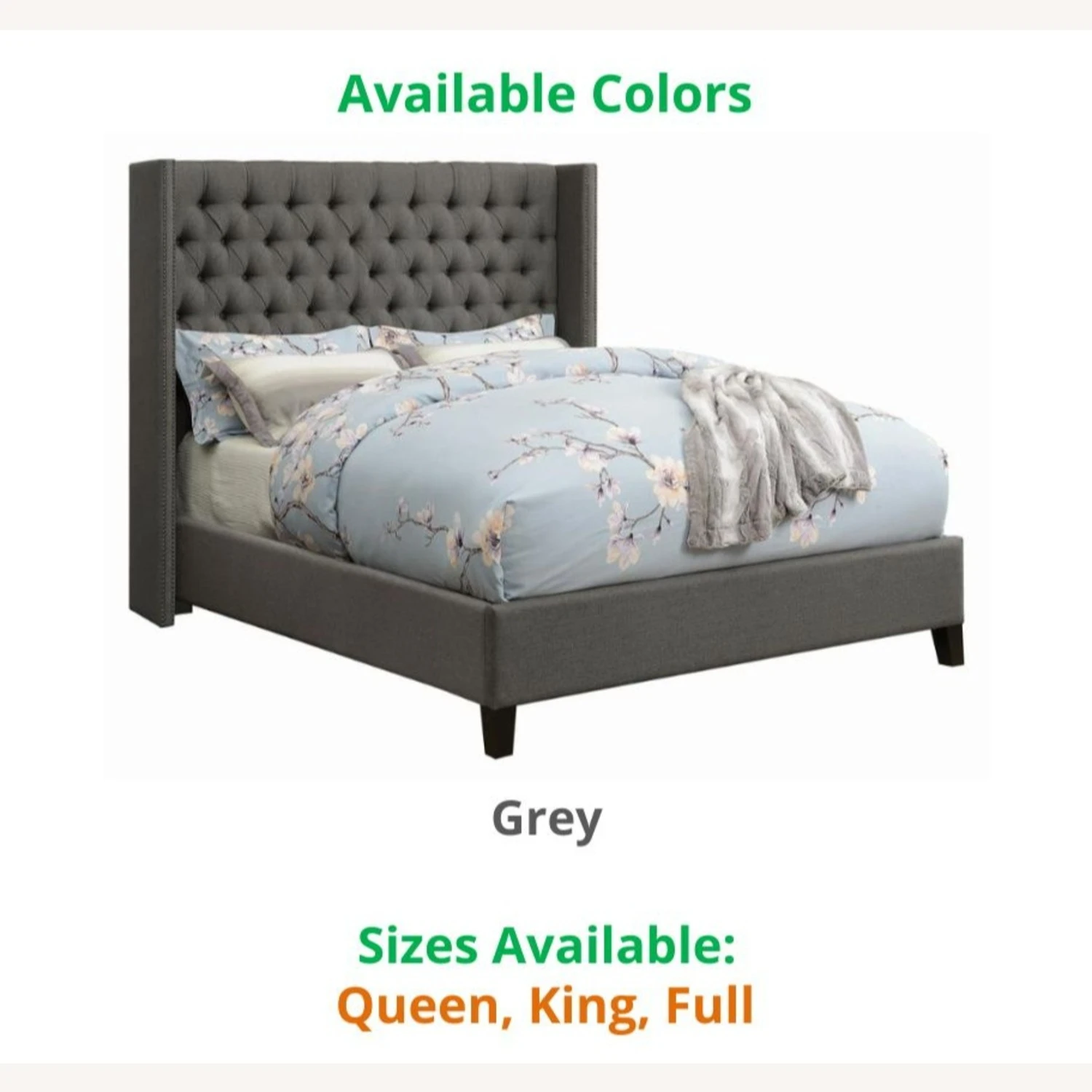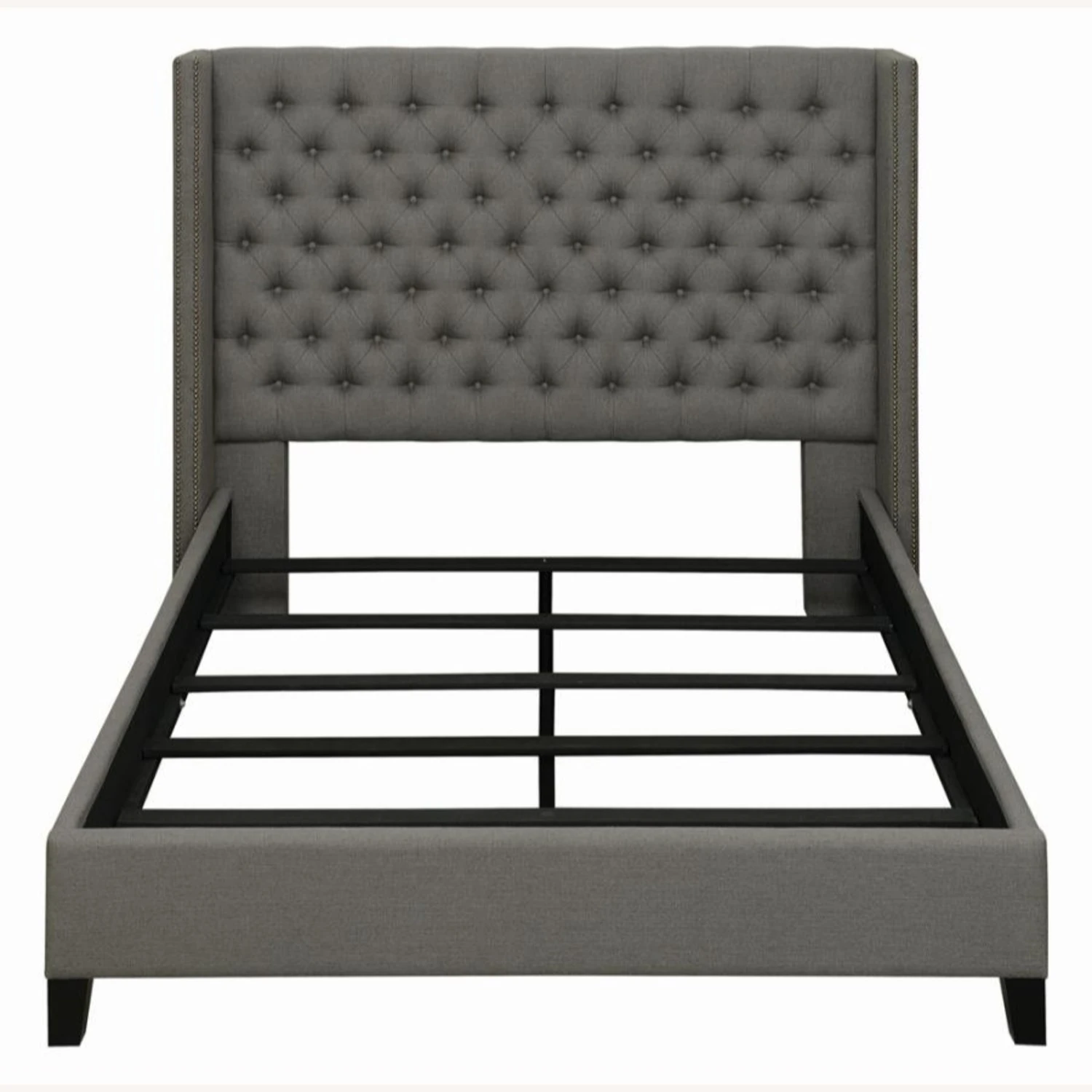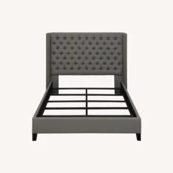 • Eye-catching demi-wing bed is upholstered in a grey woven fabric
