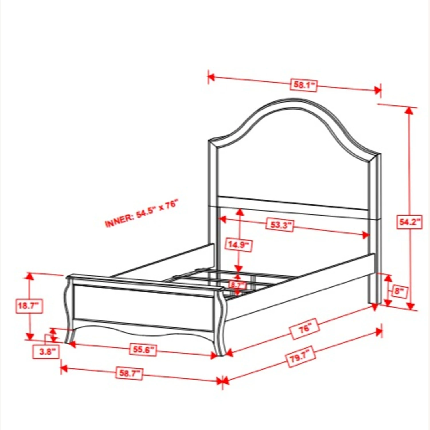 • Charming bed features flared posts, simple curved molding, and an arched headboard