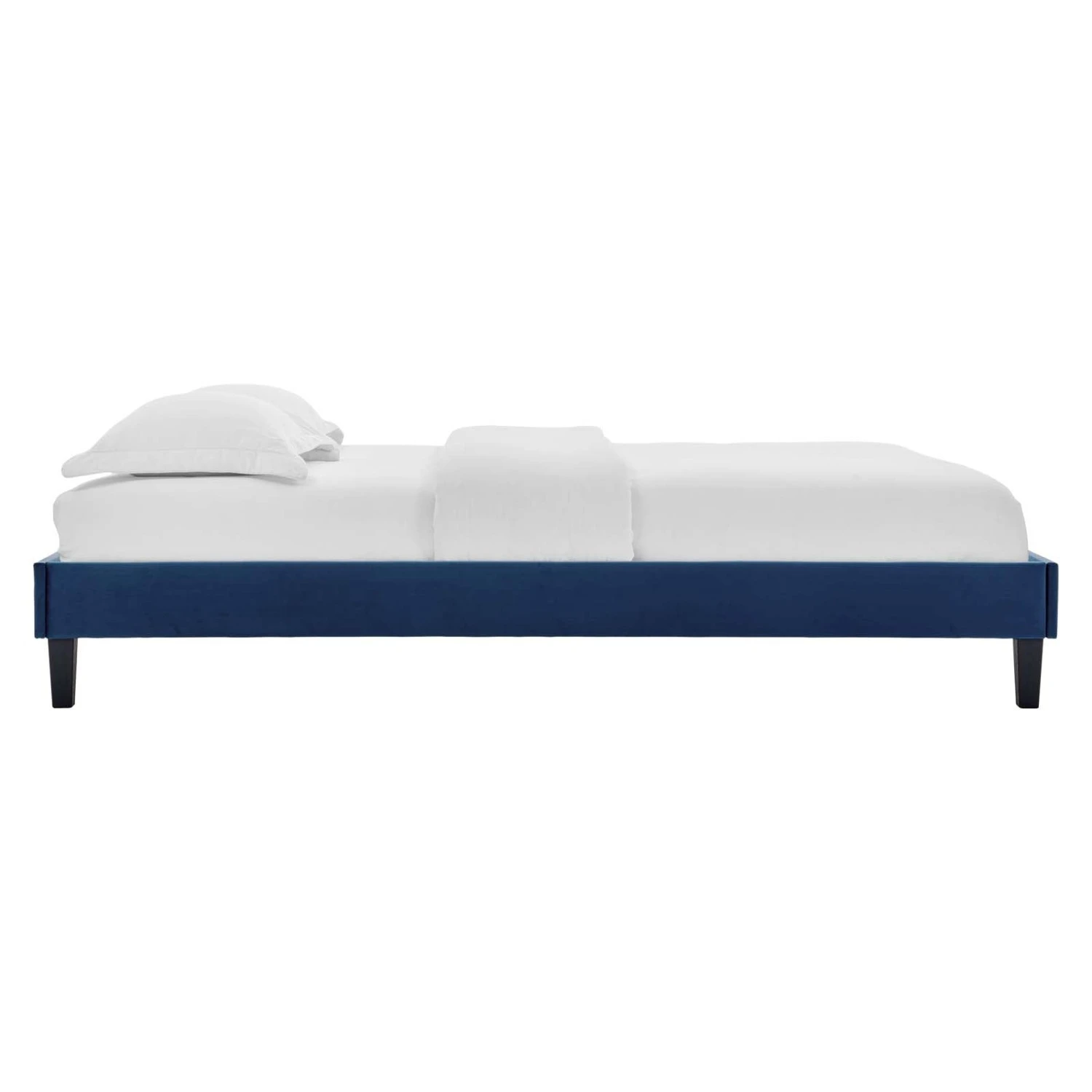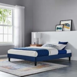 • Eliminating the need for a box spring, this platform bed is complete with a poplar wood slat support system, a reinforced center beam, and supporting legs for lasting stability.