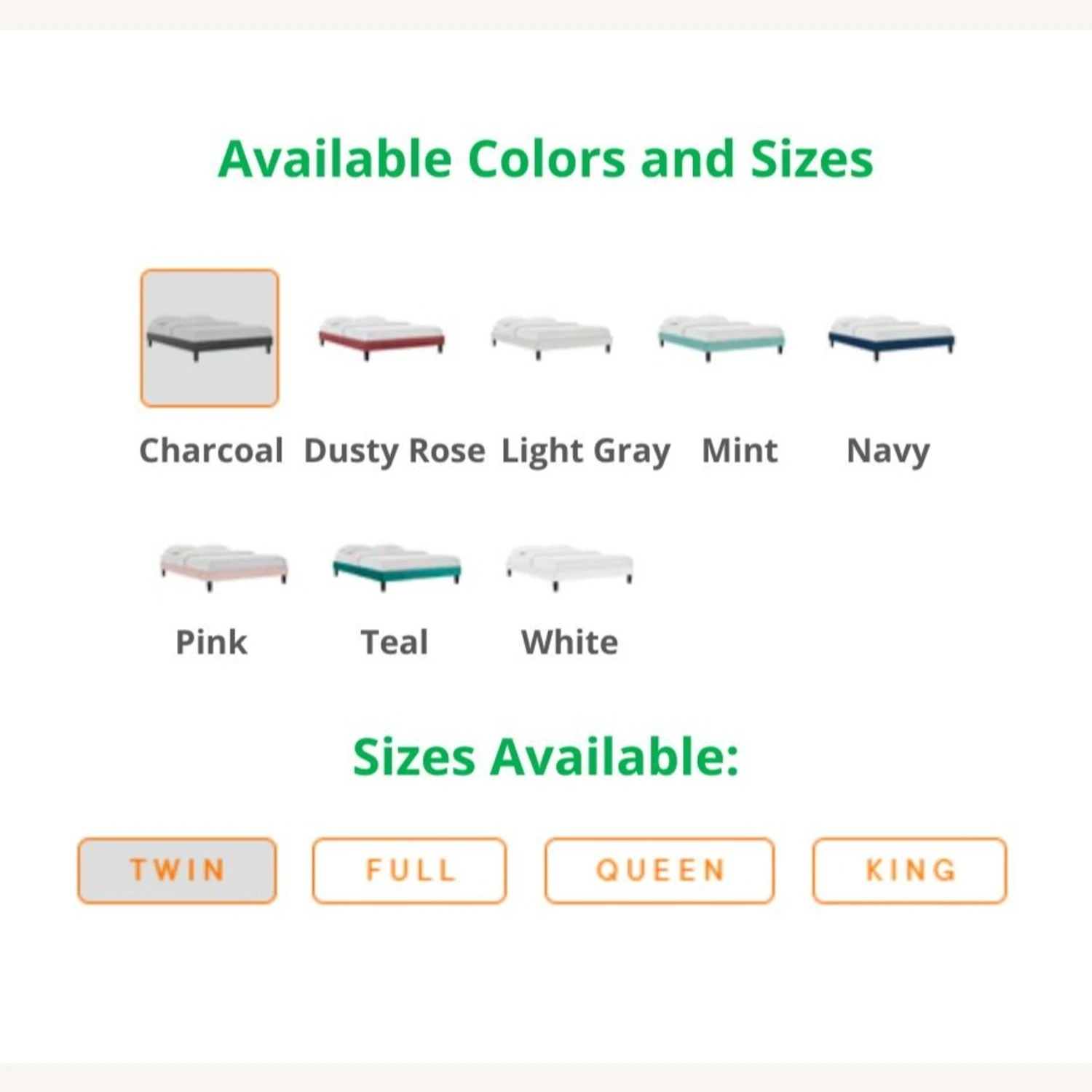 This model comes in these colors: CHARCOAL, DUSTY ROSE, LIGHT GRAY, MINT, NAVY, PINK, TEAL, & WHITE, and these sizes: TWIN, FULL, QUEEN, & KING. If you are interested in a color/size other than that of this listing, and if the quantity you wish to purchase is greater than what is listed here, please message us for availability.