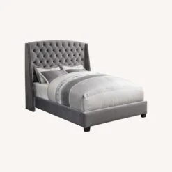 • Stately demi-wing upholstered bed anchors a classic, timeless aesthetic