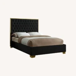 • The bed is covered in black velvet fabric for a luxe look, and it’s deeply tufted for added luxuriousness.
