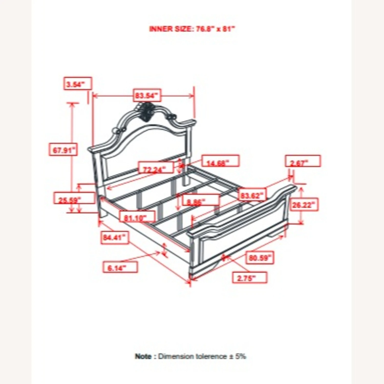 Eastern King Bed 83.75”w x 85.00”d x 67.50”h (4 slats)