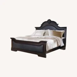 • Comfortably padded, arched headboard is upholstered in leatherette