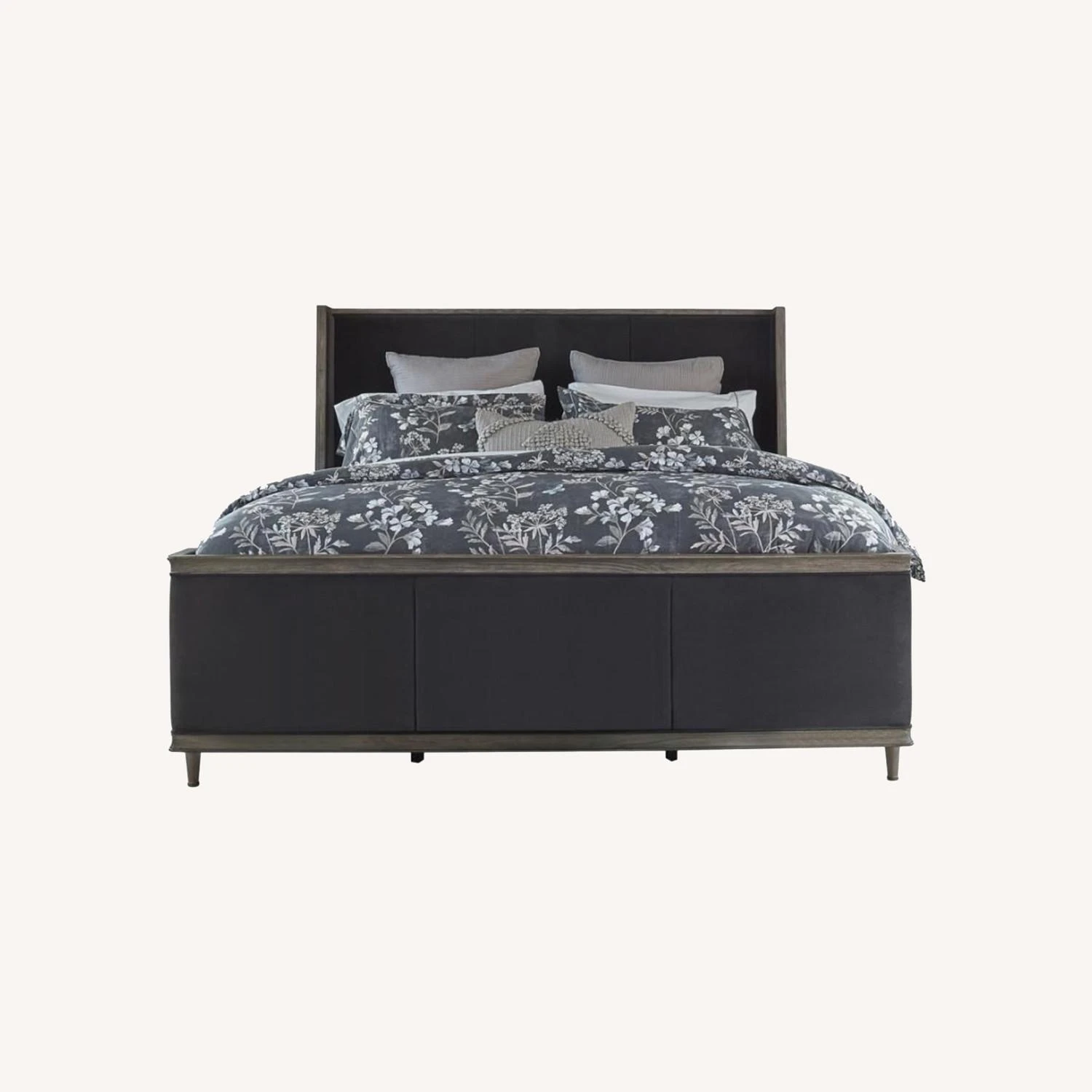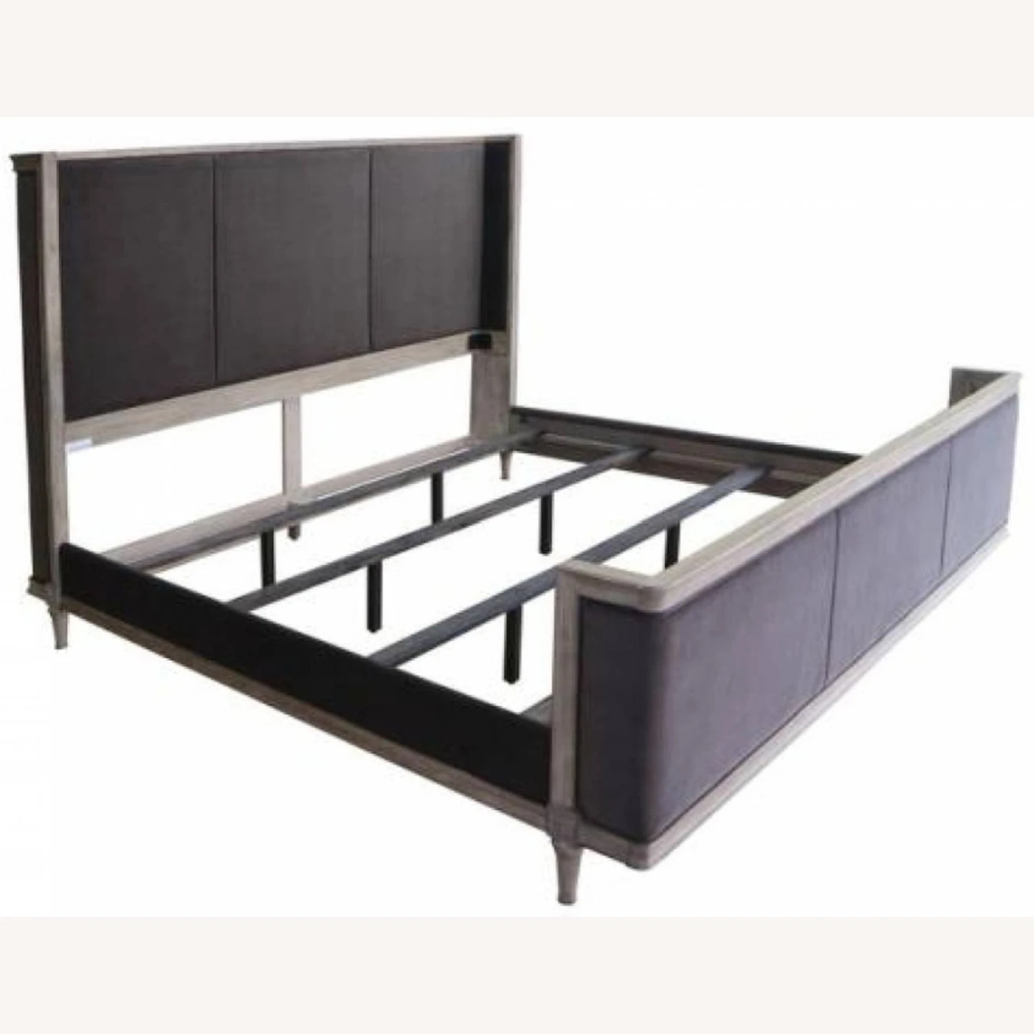 • French chamber bed has wrap around wings and is fully framed and upholstered with charcoal grey matte velvet