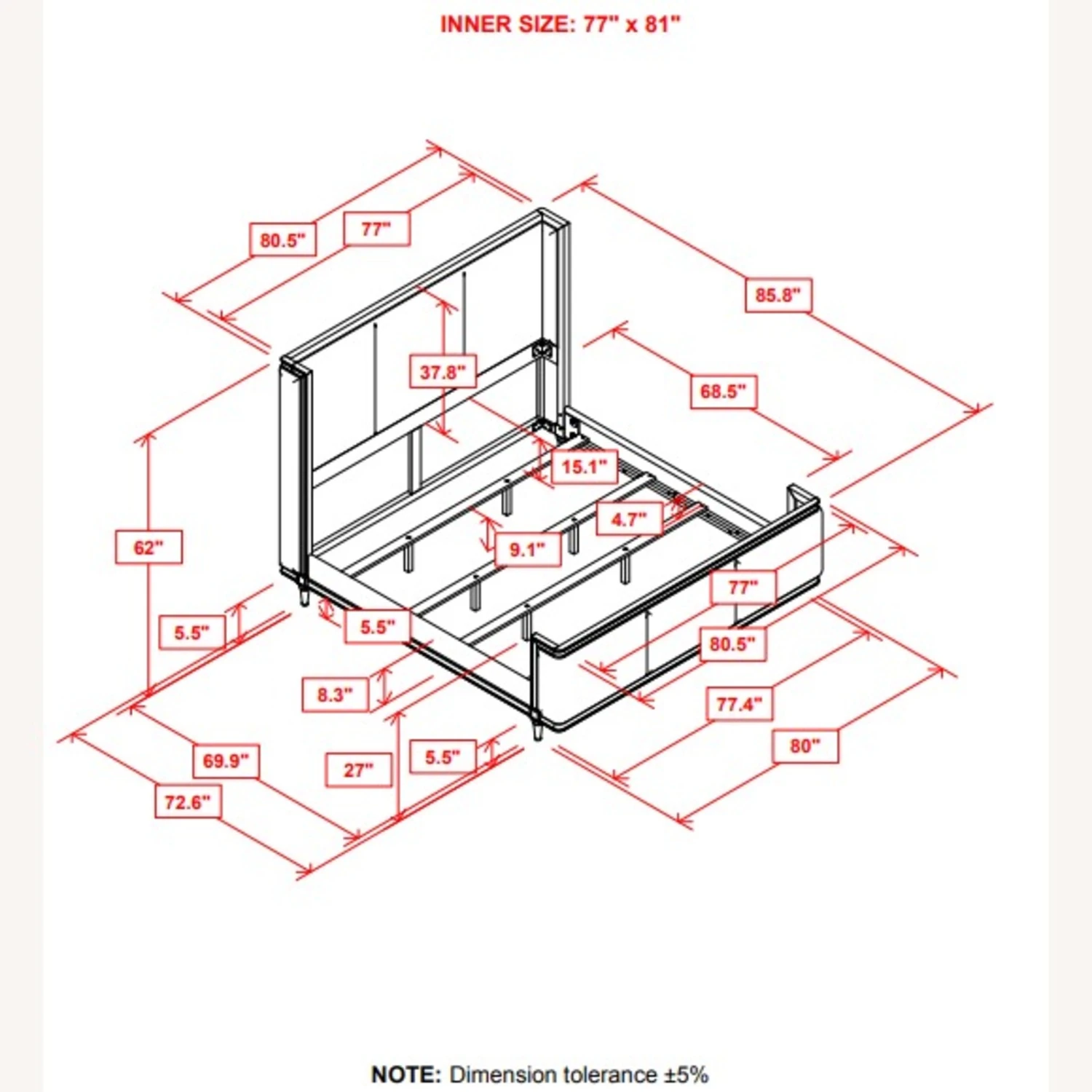King Bed 80.00”w x 85.75”d x 60.25”h (4 slats)