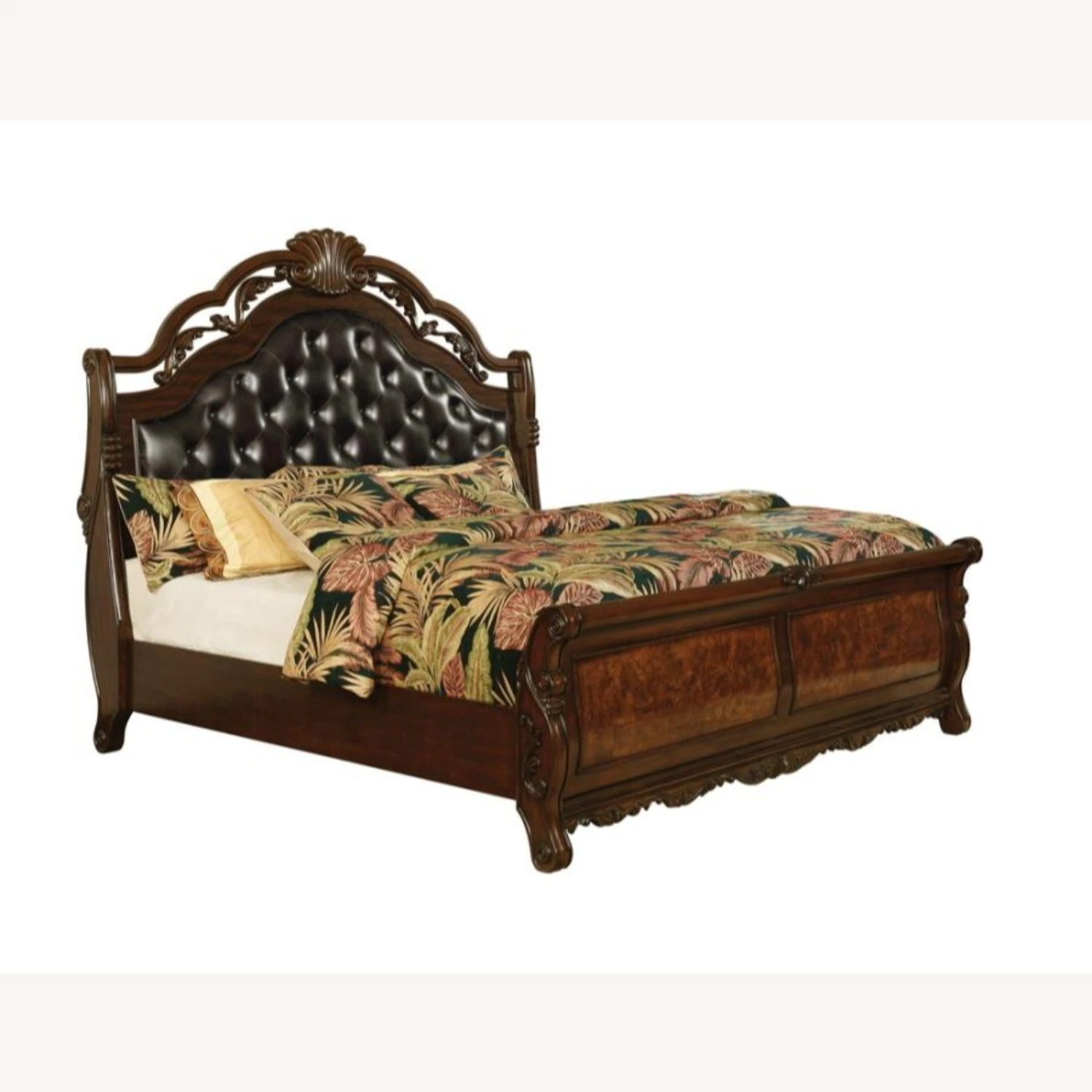 • Sleigh bed has tufted leatherette upholstered headboard matching to mirror on dresser