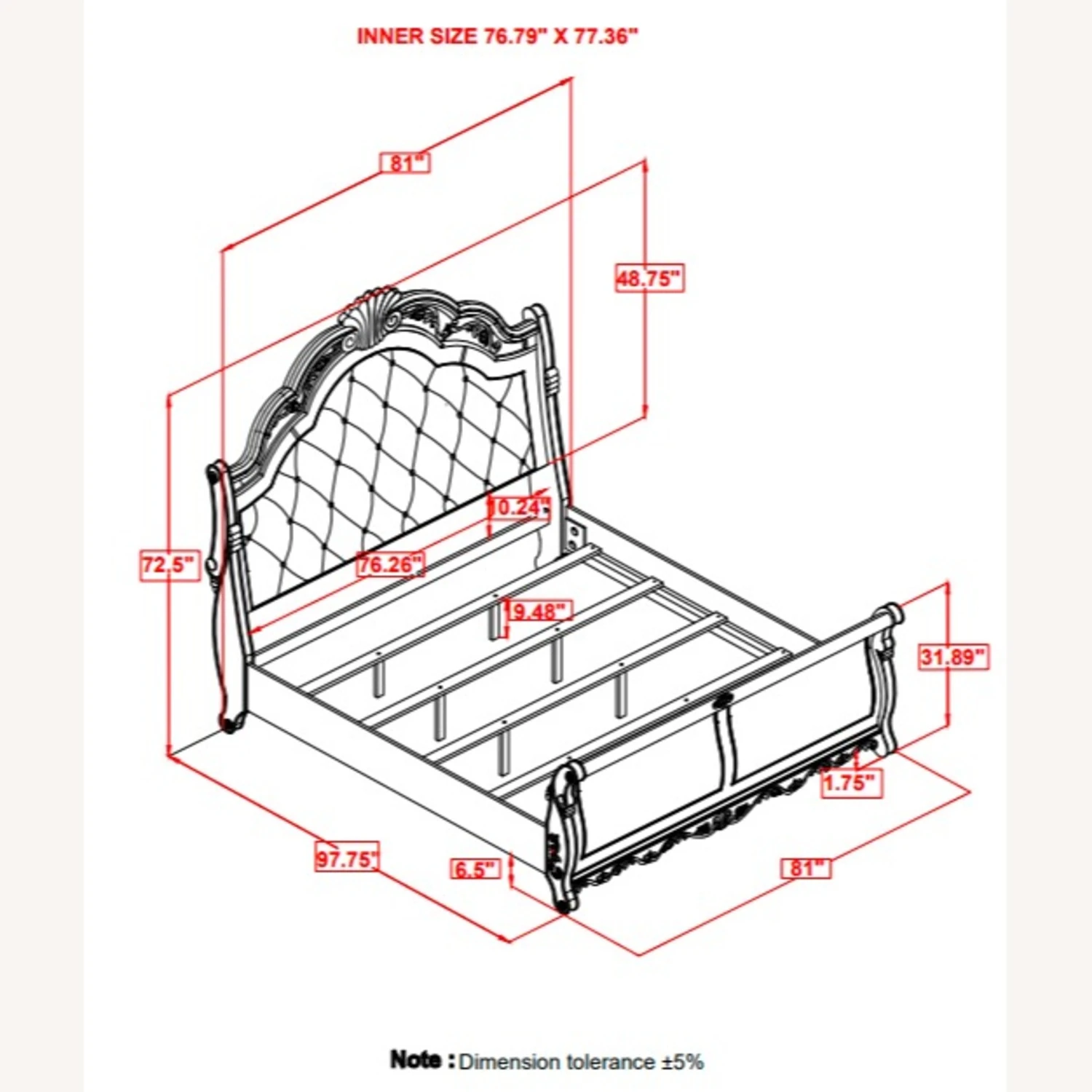 King Bed 81.00”w x 97.25”d x 73.25”h (4 slats)