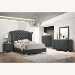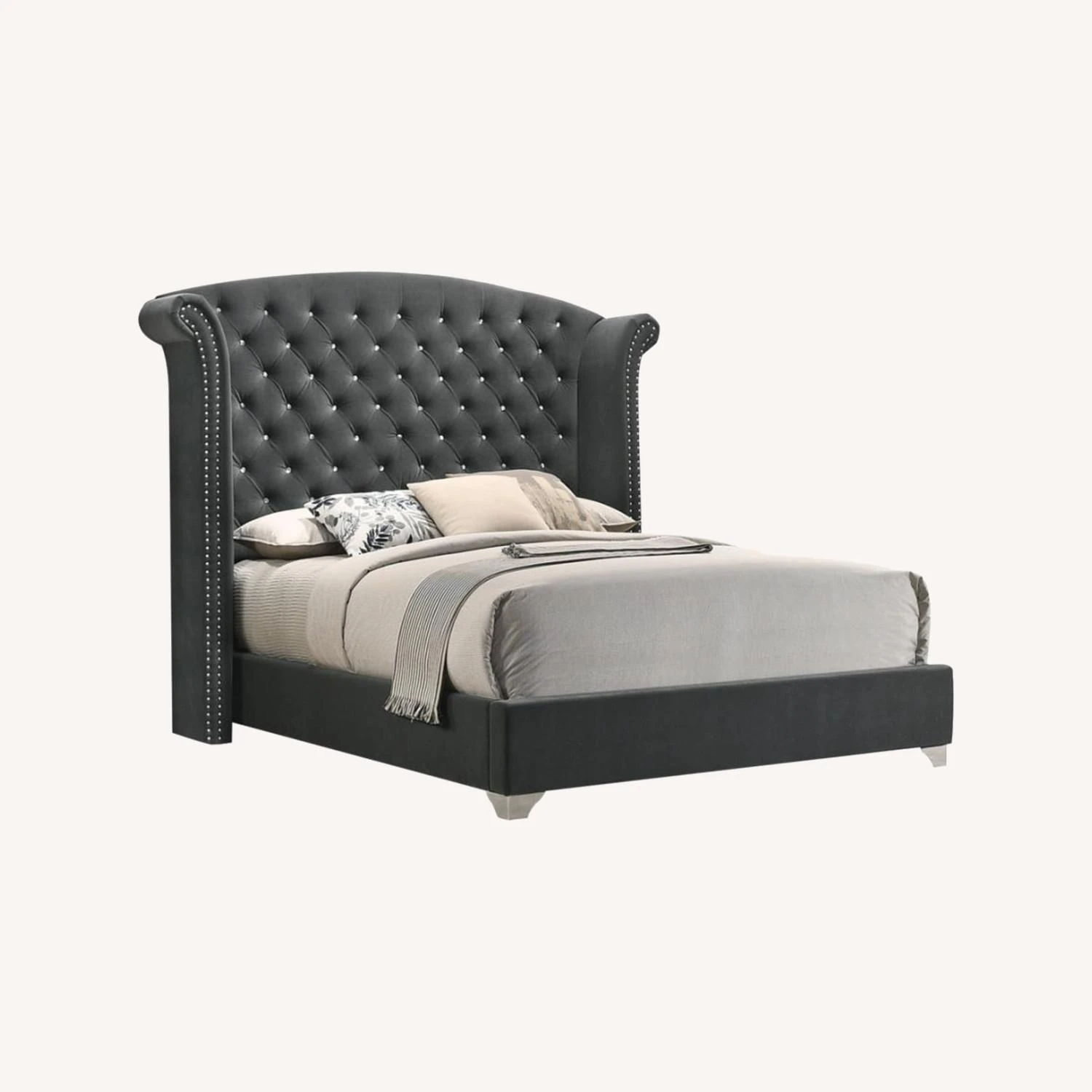 • Entirely upholstered with matte velvet in options of pacific blue or grey with acrylic bling tufted buttons accented with crystal and chrome pull handles