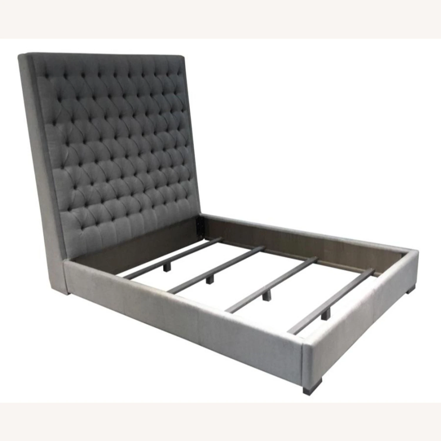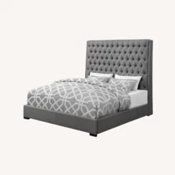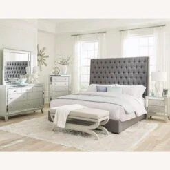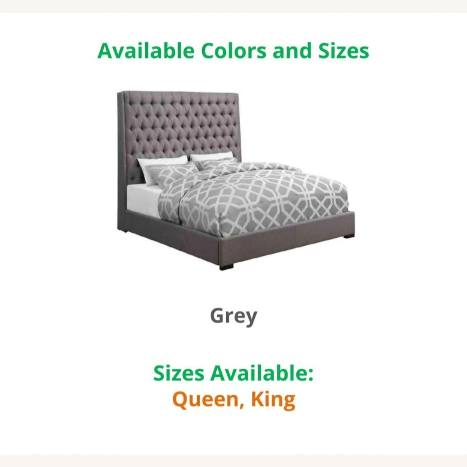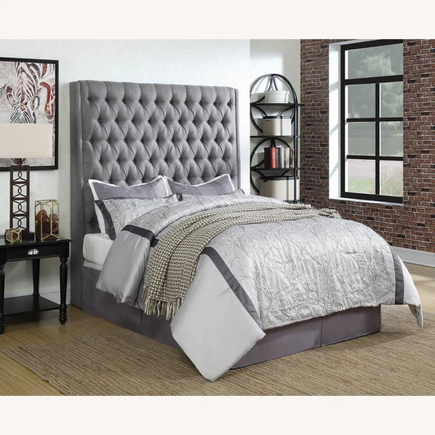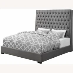 • Dramatic bed with tall, tufted headboard and woven fabric upholstery for a clean, classic presentation