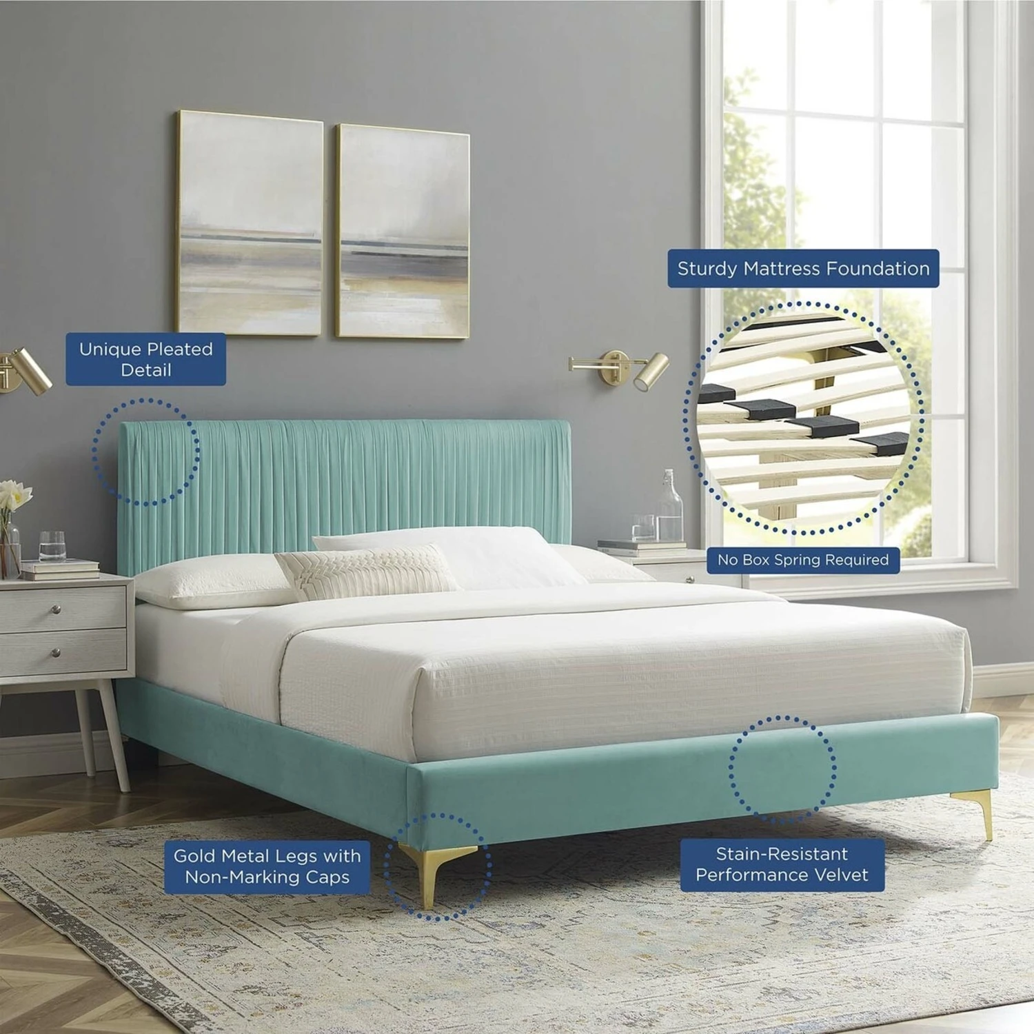 • A king size bed covered in stain-resistant performance velvet, this platform bed is a sturdy mattress foundation for memory foam, innerspring, latex, and hybrid mattresses.