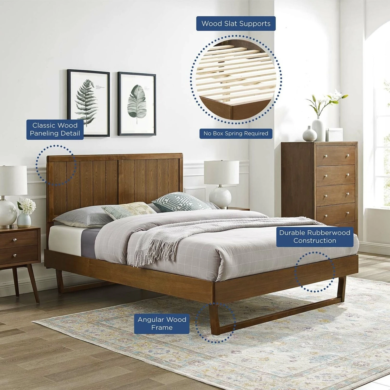 • Eliminating the need for a box spring, this queen bed is complete with a wood slat support system, reinforced center beam, and supporting legs that make it a lasting mattress foundation for memory foam, latex, innerspring, and hybrid mattresses.