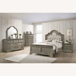 • Comfortably padded, arched headboard is upholstered in linen-like fabric with deep tufting