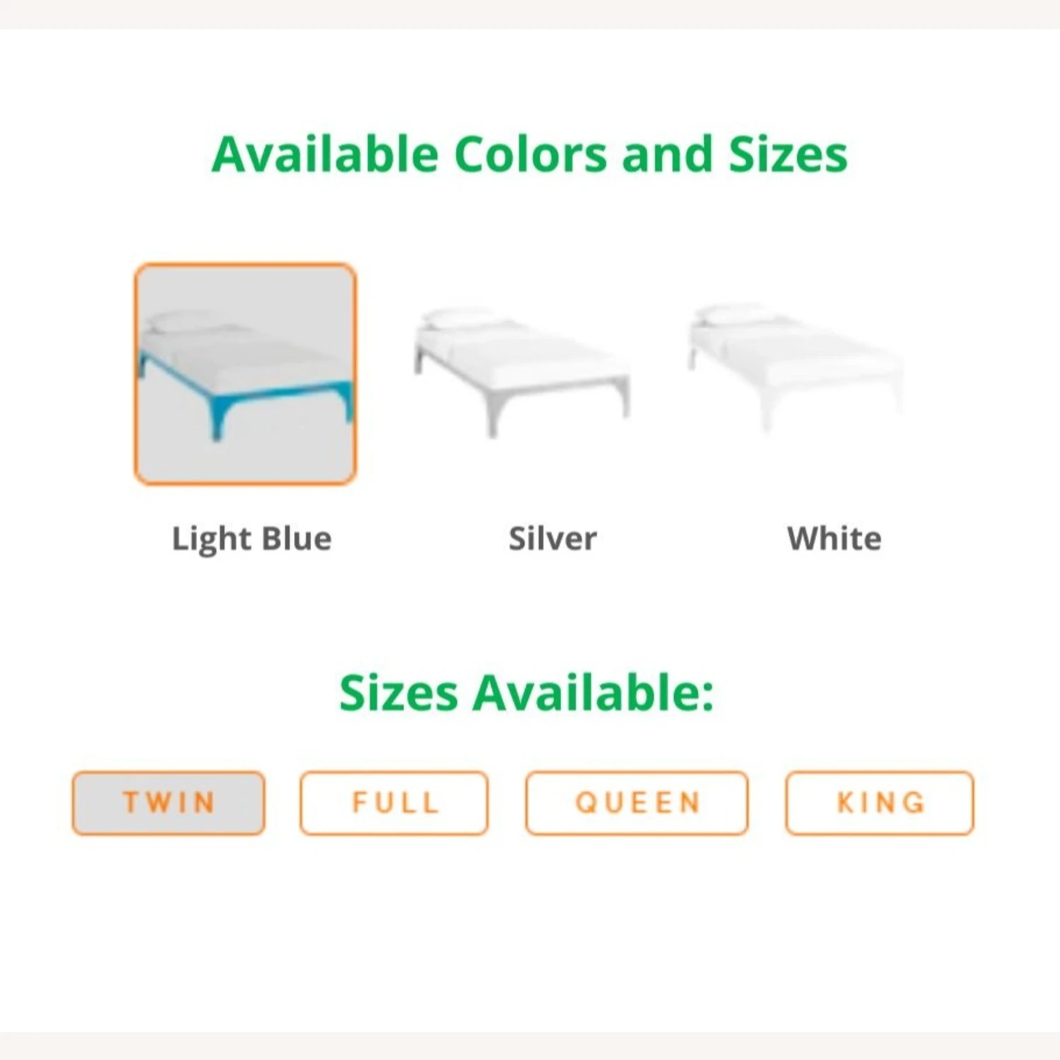 This model comes in these colors: LIGHT BLUE, SILVER, & WHITE, and these sizes: TWIN, FULL, QUEEN, & KING. If you are interested in a color/size other than that of this listing, and if the quantity you wish to purchase is greater than what is listed here, please message us for availability.
