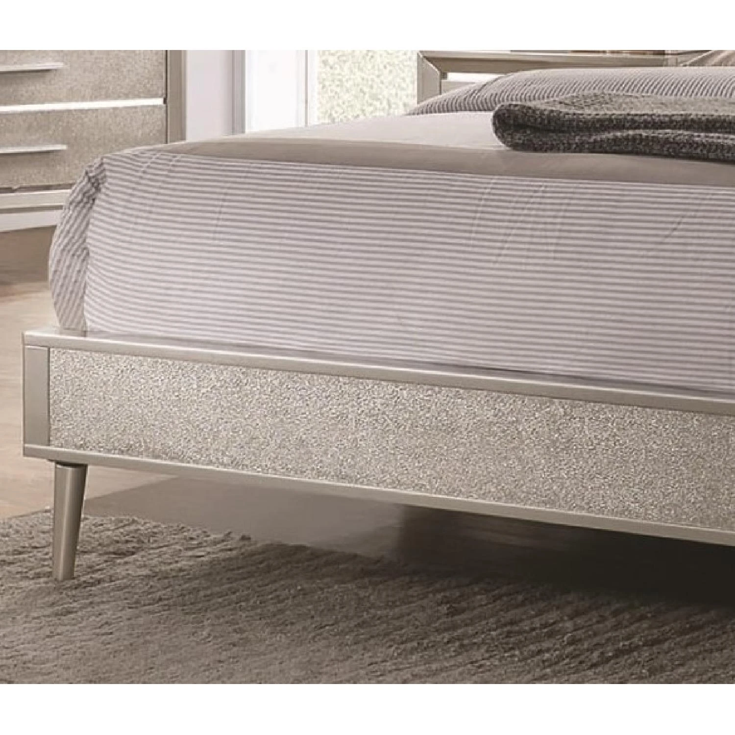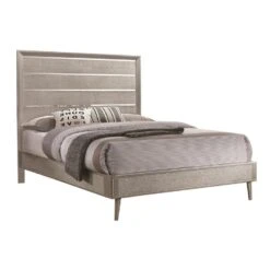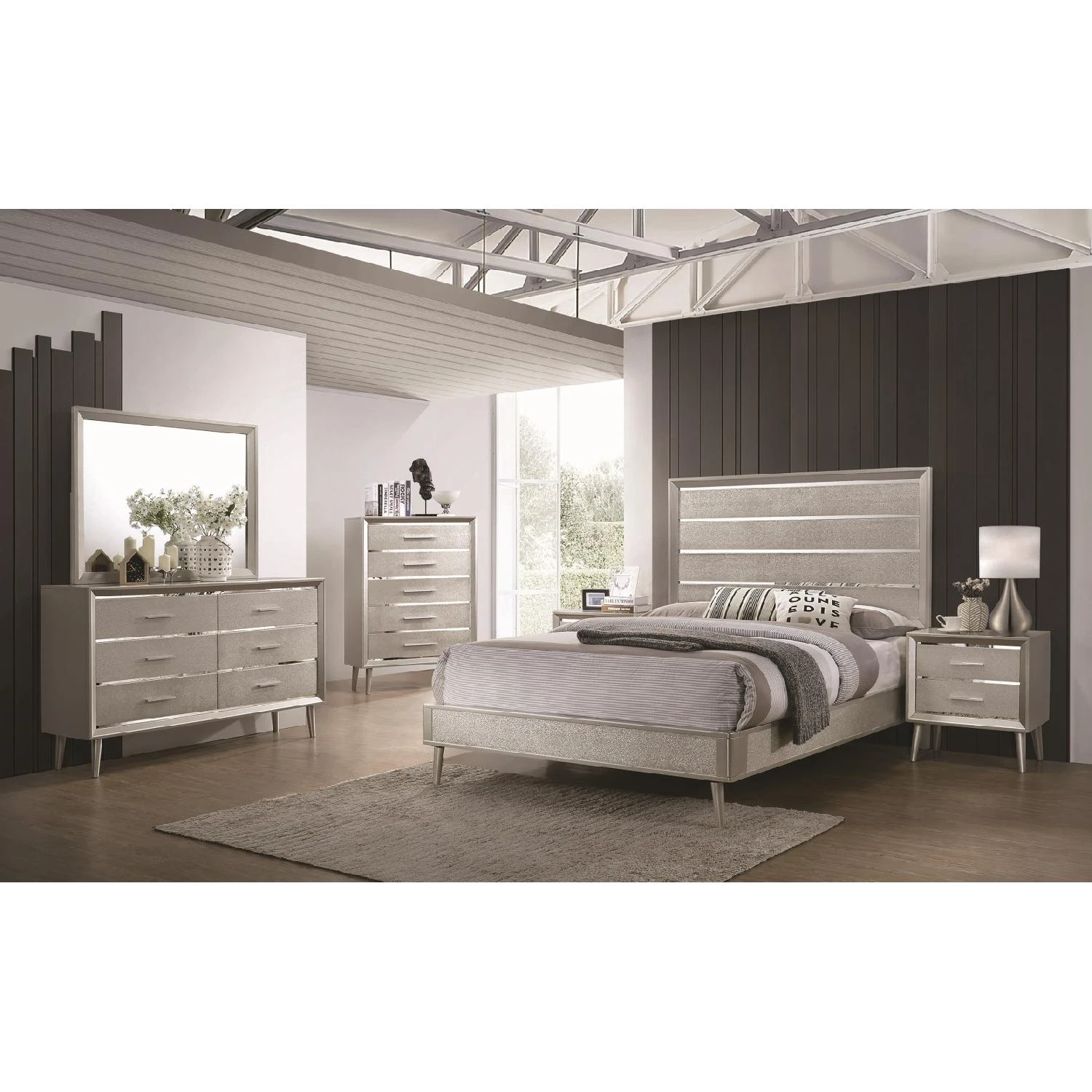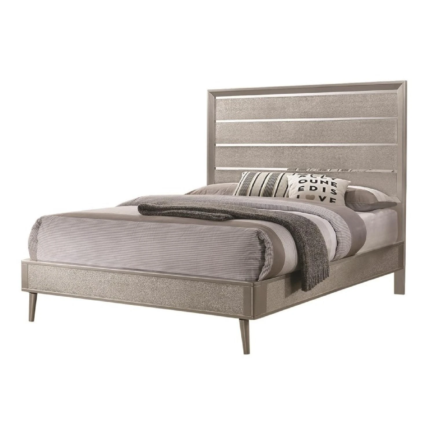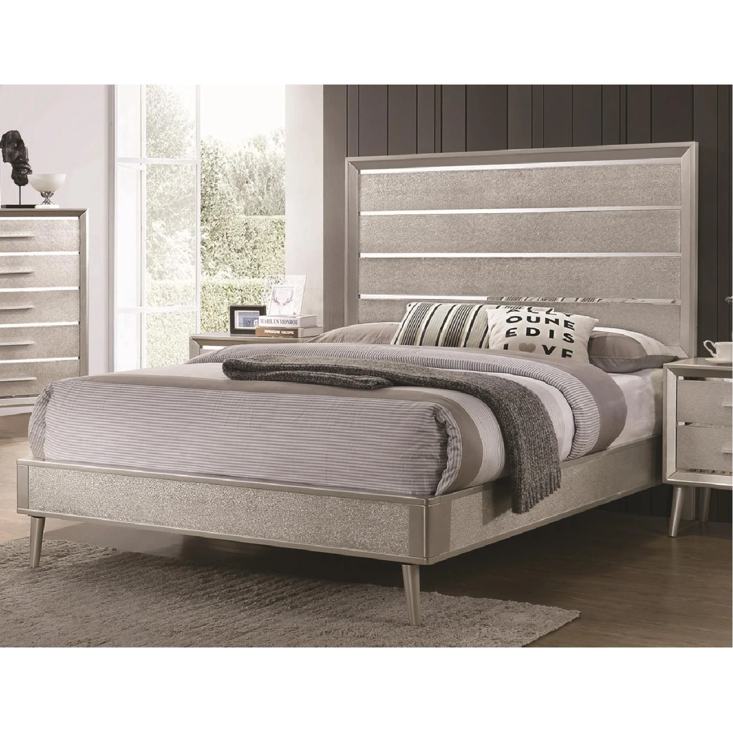 Dazzle up your bedroom décor with mid-century modern glamour. This elegant silver bed frame lends elegance and style to any space. A metallic sterling finish adds shimmering sparkle to its sleek silhouette. Gleaming lines of shining, mirrored acrylic adorn its headboard to give it an extra touch of polish. This beautiful wooden bed is available in multiple sizes to accommodate any bedroom.