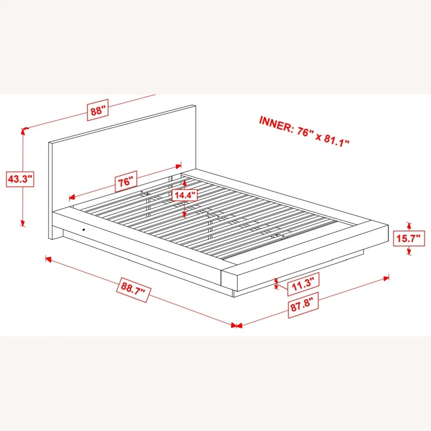 King Bed 88.00”w x 88.75”d x 43.25”h (14 slats)