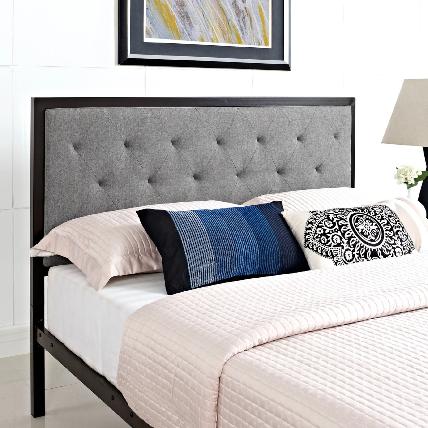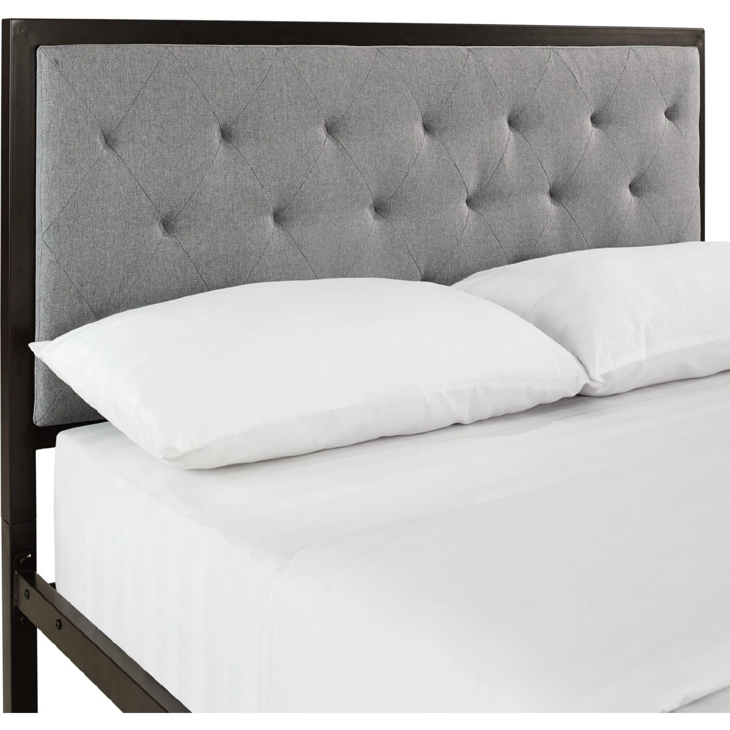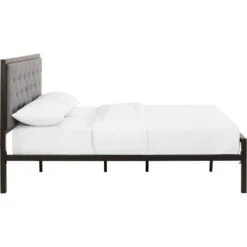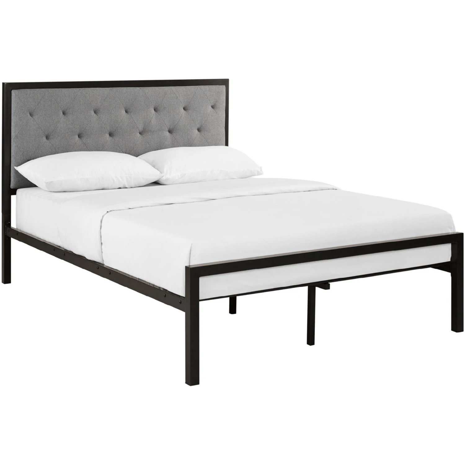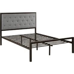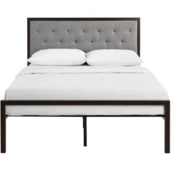• This full bed comes with a powder-coated steel frame that offers sturdy and long-lasting support, while the fabric headboard with deep tufted buttons adds a touch of magnificence to an otherwise minimalist design.