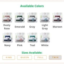 This model comes in these colors: DUSTY ROSE, EMERALD, GRAY, LIGHT GRAY, MAROON, NAVY, PINK, TEAL, & WHITE, and these sizes: KING, QUEEN, FULL, & TWIN. If you are interested in a color/size other than that of this listing, and if the quantity you wish to purchase is greater than what is listed here, please message us for availability.
