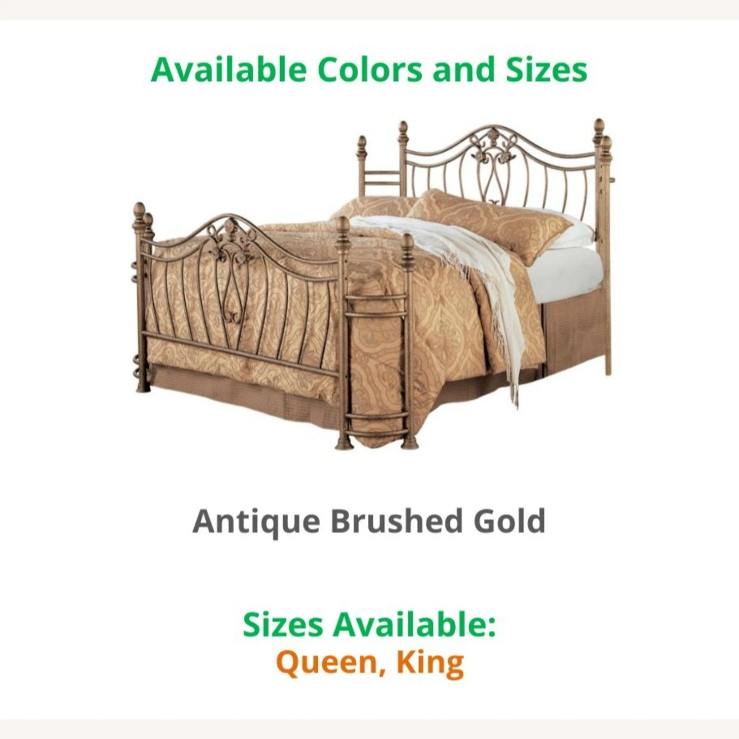 This model comes in this ANTIQUE BRUSHED GOLD, and these sizes: KING and QUEEN. If you are interested in a color/size other than that of this listing, and if the quantity you wish to purchase is greater than what is listed here, please message us for availability.