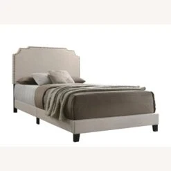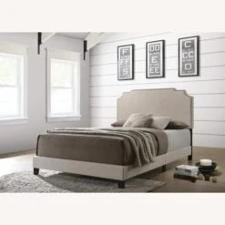 • Sophisticated headboard profile with individually driven antique brass nailhead trim