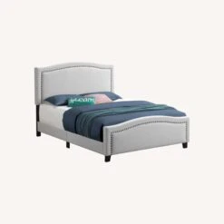 • Soft pediment style headboard framed with individually driven brass nail head trim