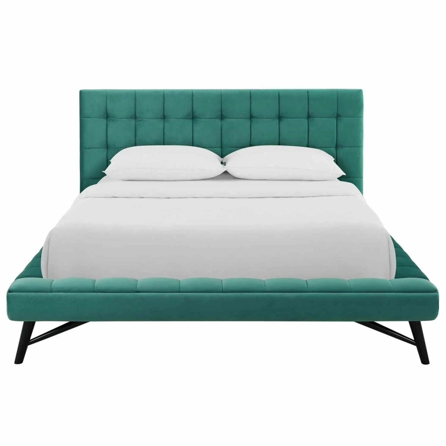 • Mid-century elegance sweeps into your master suite or guest room decor with its biscuit tufting and polyester fabric upholstery that spans both headboard and frame.