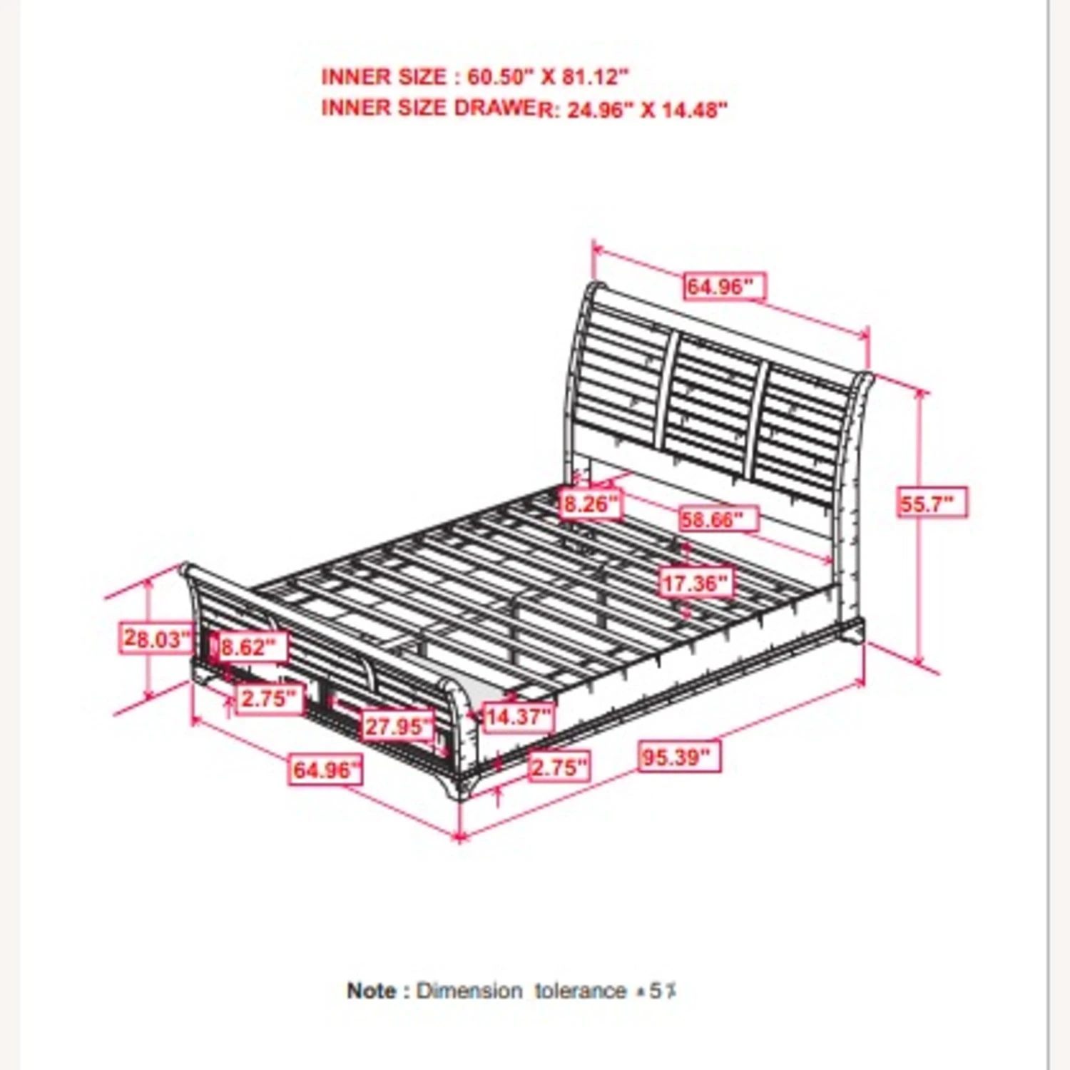 Queen Bed 64.75″w x 95.50″d x 55.75″h (12 slats)
