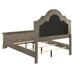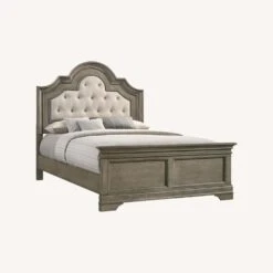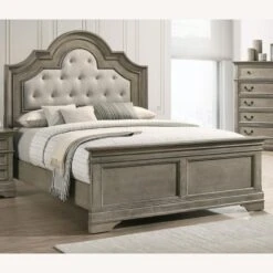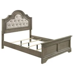 • Comfortably padded, arched headboard is upholstered in linen-like fabric with deep tufting