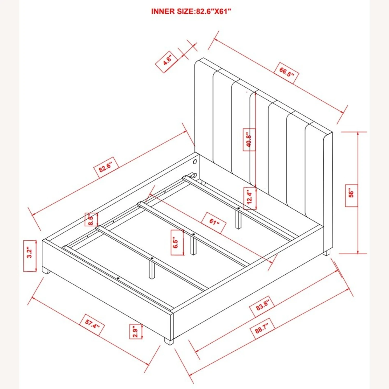 Queen Bed 66.00”w x 89.00”d x 56.00”h (4 slats)