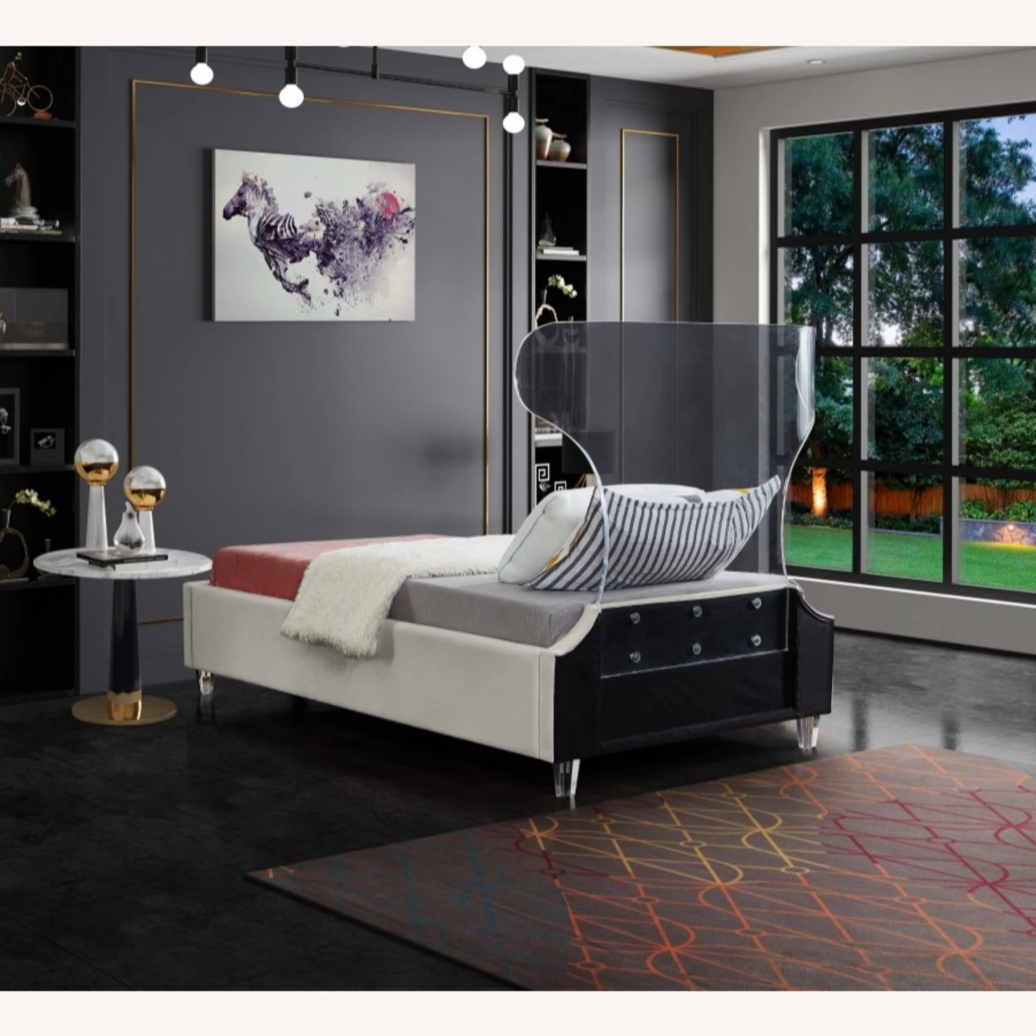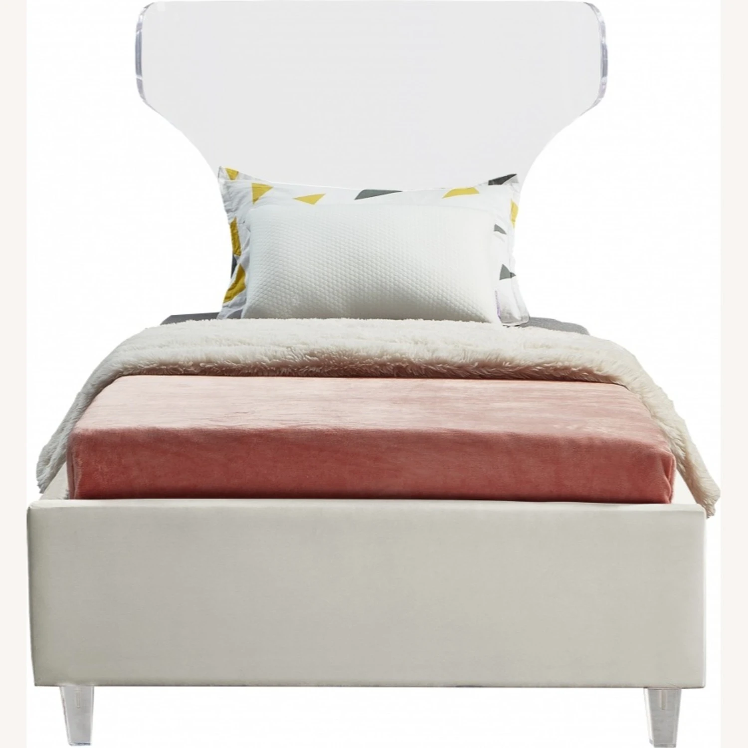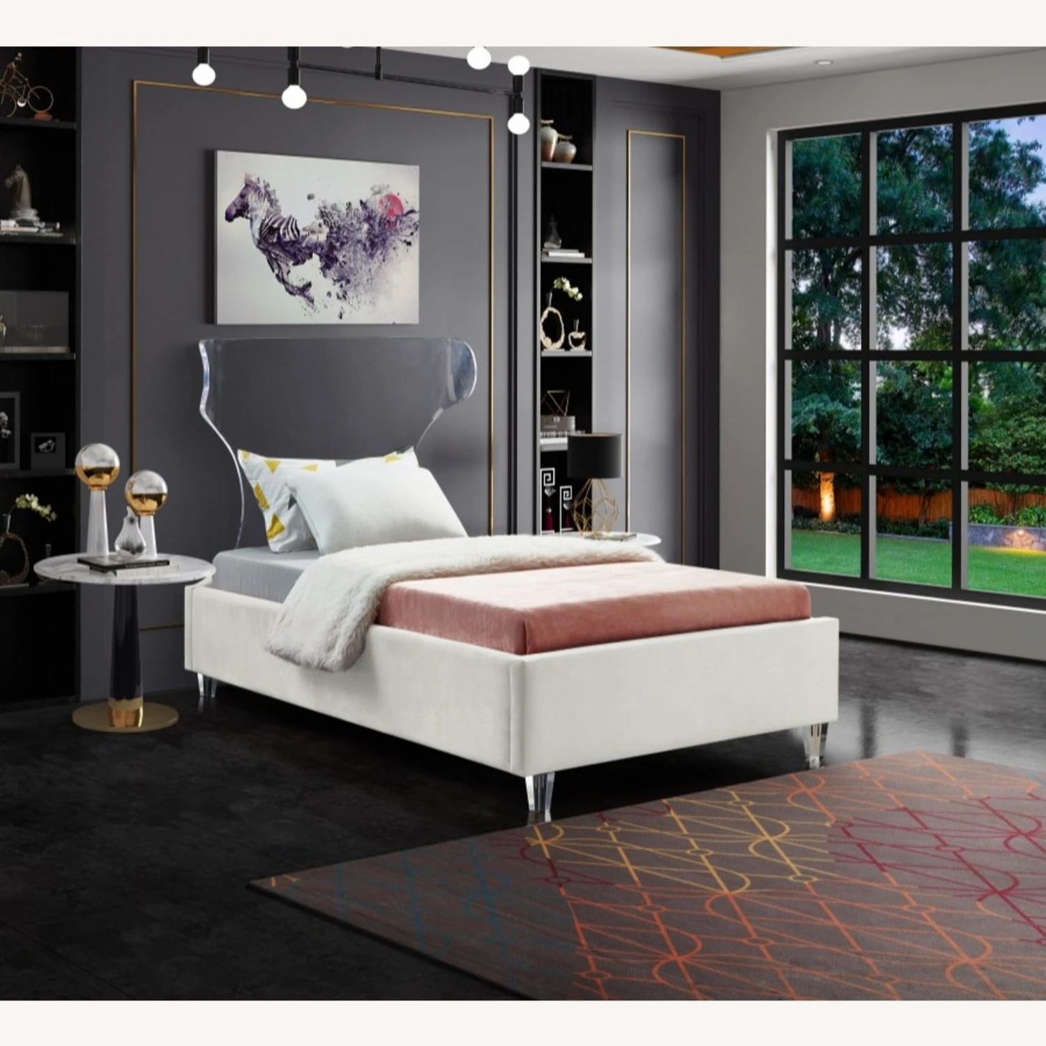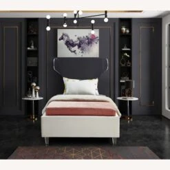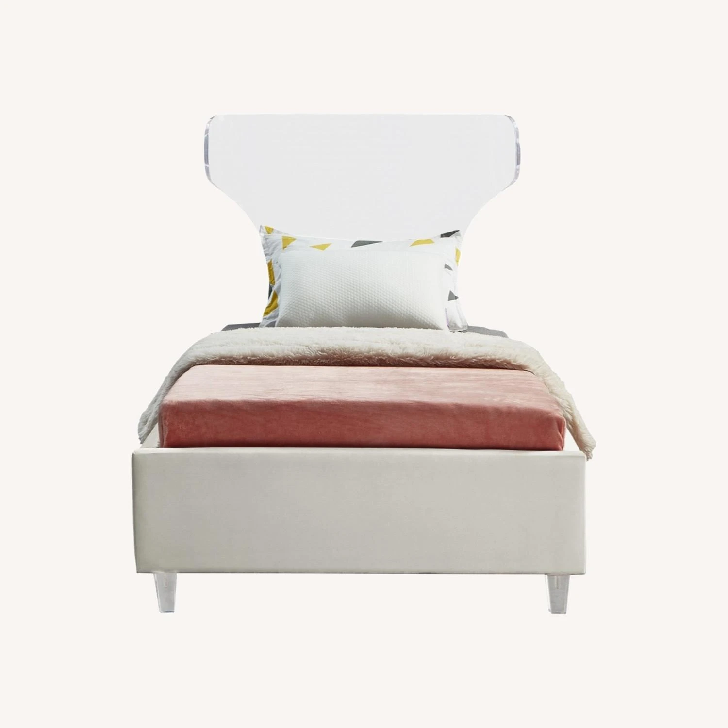 • There’s nothing scary about the cream velvet twin size bed, with its plush cushioned and upholstered side rails and footboard.