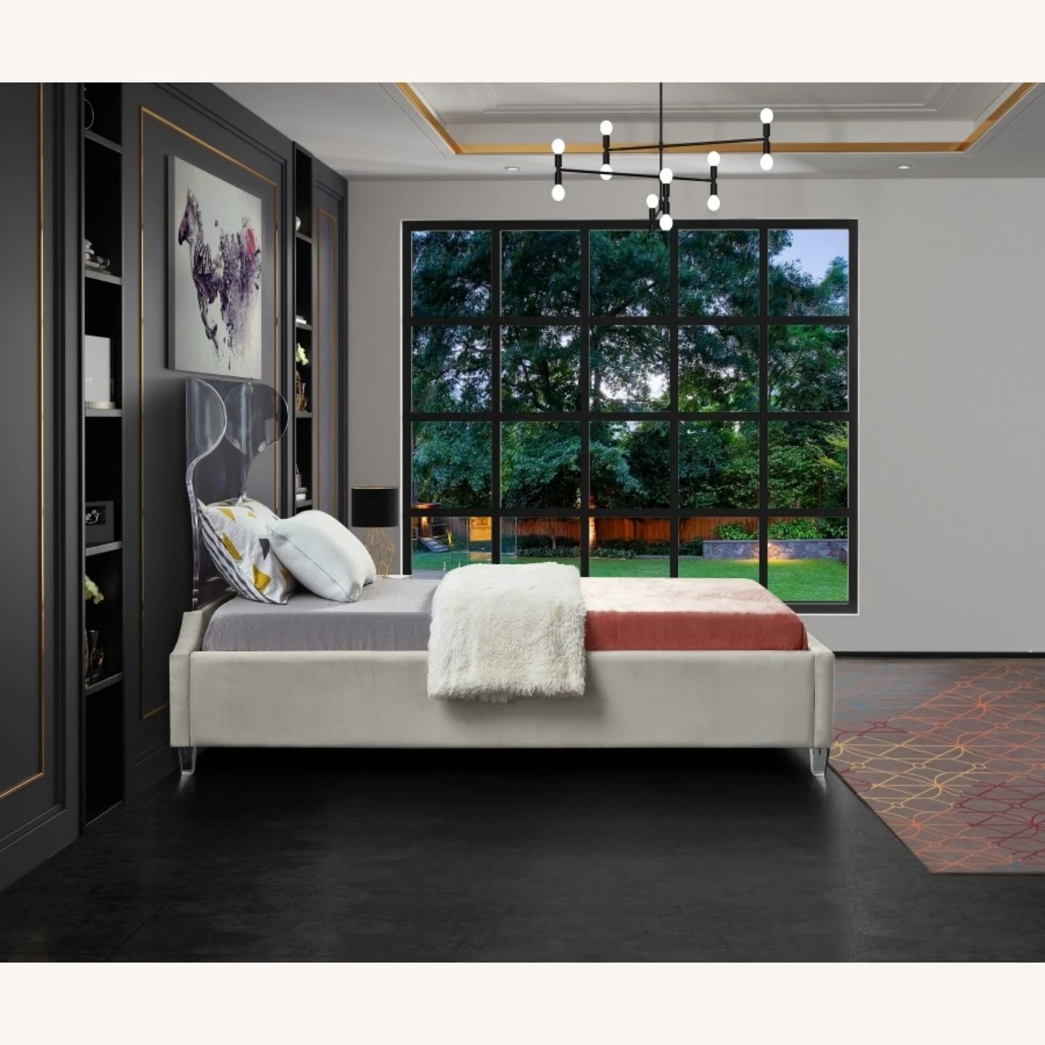 • A curved transparent acrylic headboard allows you to situate it in front of a window without blocking the view, and matching acrylic legs offer a beautiful contemporary appearance.