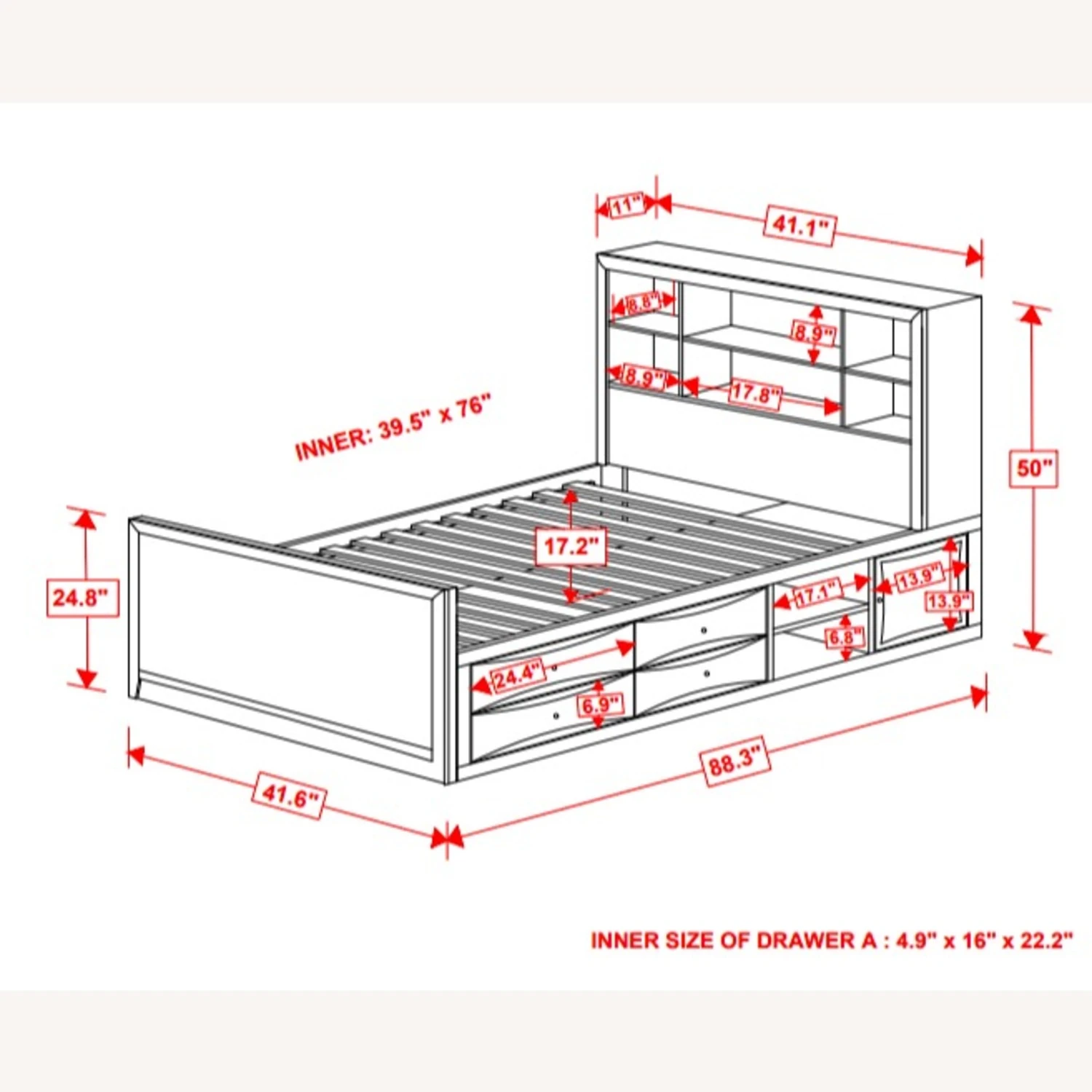 Twin Storage Bed 41.25”w x 88.25”d x 50.00”-24.75”h (14 slats)
