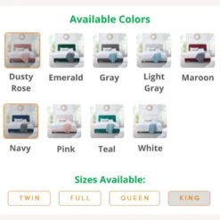 This model comes in these DUSTY ROSE, EMERALD, GRAY, LIGHT GRAY, MAROON, NAVY, PINK, TEAL, and WHITE, and these sizes: TWIN, FULL, KING, and QUEEN. If you are interested in a color/size other than that of this listing, and if the quantity you wish to purchase is greater than what is listed here, please message us for availability.