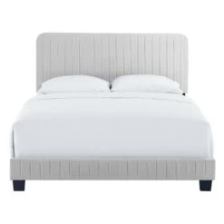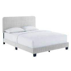 • Upholstered in stain-resistant performance velvet, this platform bed eliminates the need for a box spring with a wood slat support system to allow for ample air circulation and a reinforced center beam and support legs for added durability.