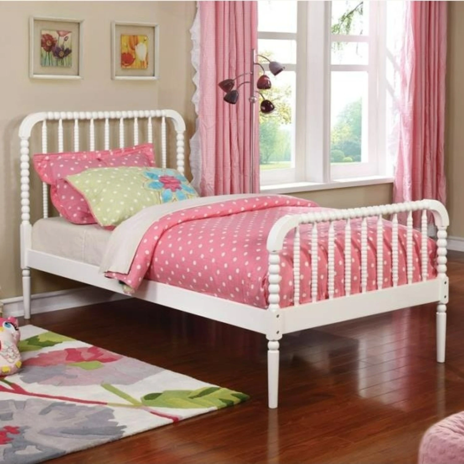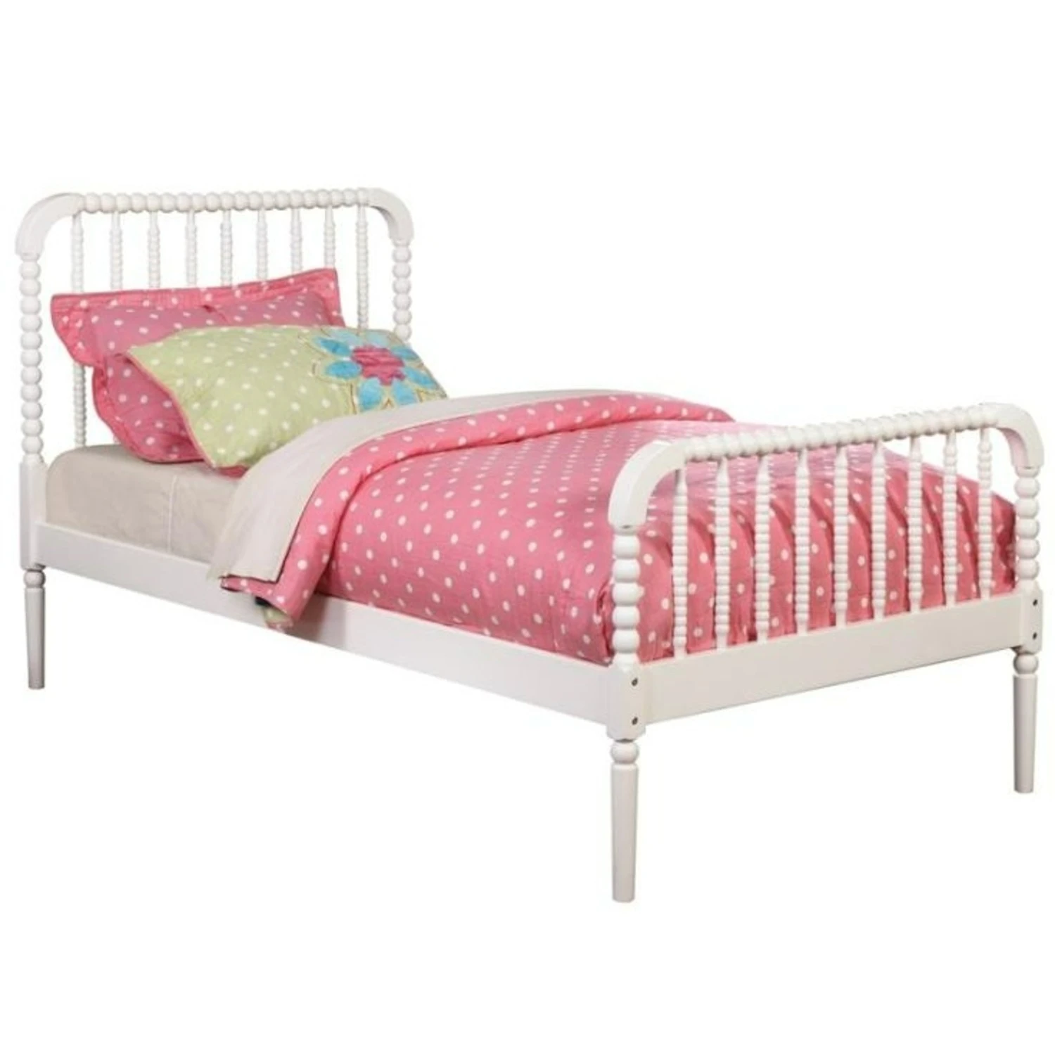 • This twin spindle bed in a white finish will surely be adored as the centerpiece in your child’s bedroom