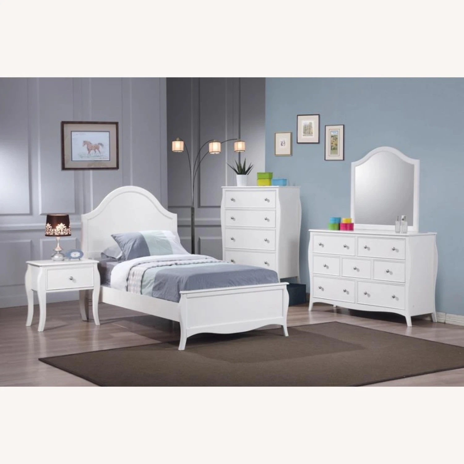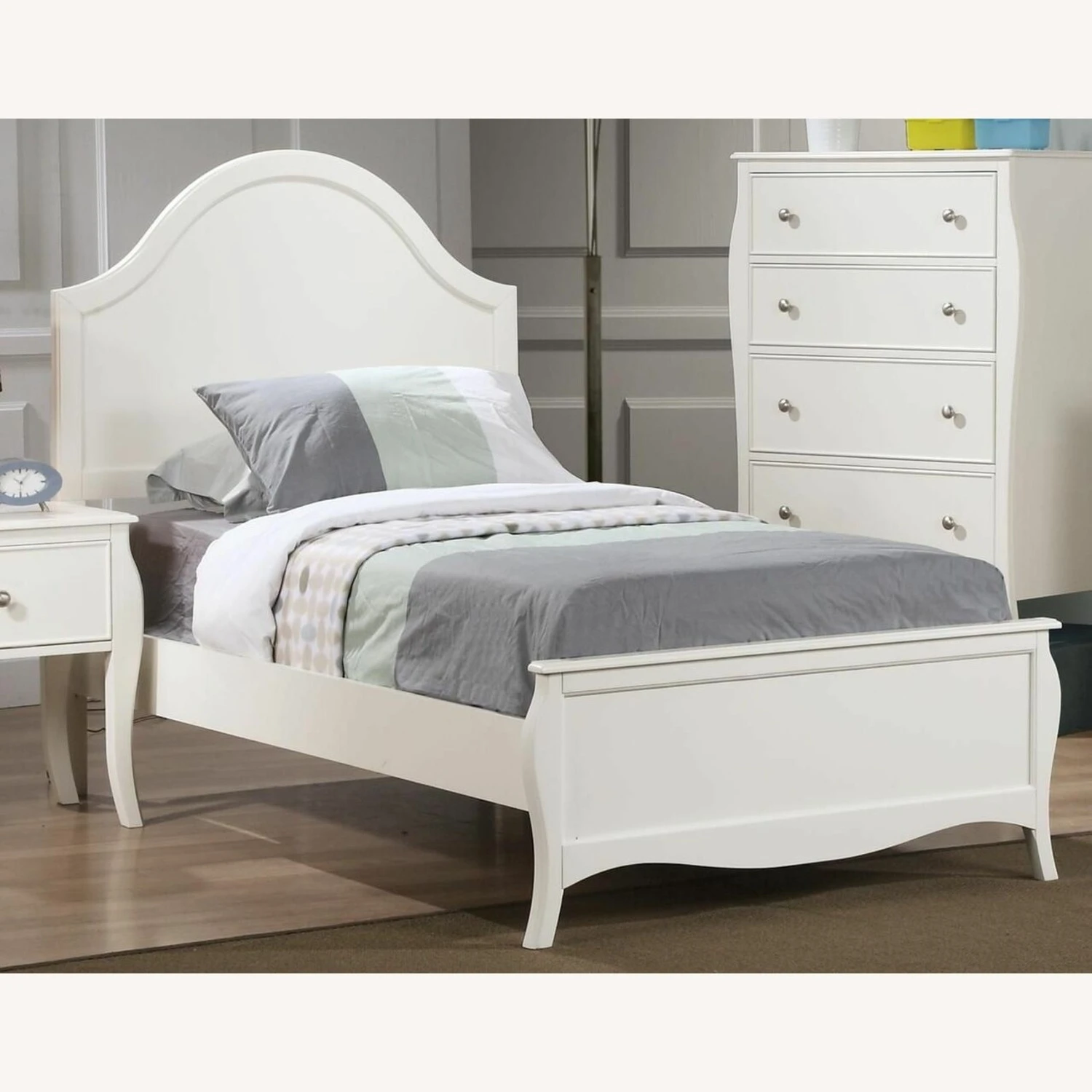 • Cool white finish is a perfect complement colored bedding that changes up the look of the room as your child grows